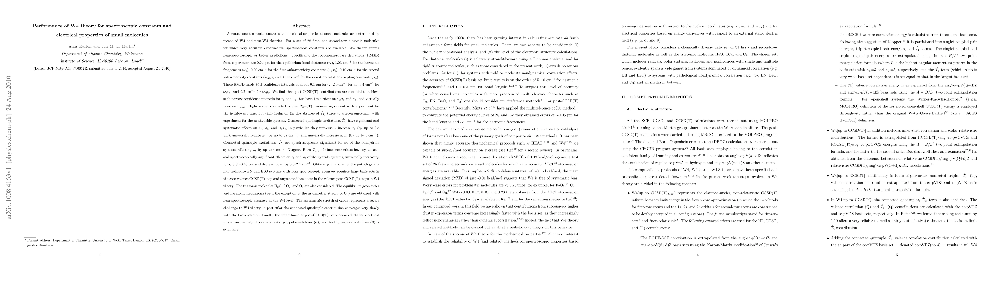 W4 theory provides highly accurate predictions for spectroscopic constants and electrical properties of small molecules, with near-experimental precision for bond distances and frequencies. Connected quadruple excitations (\hat{T}_4) notably affect molecular properties, while post-CCSD(T) effects are crucial for electrical properties.