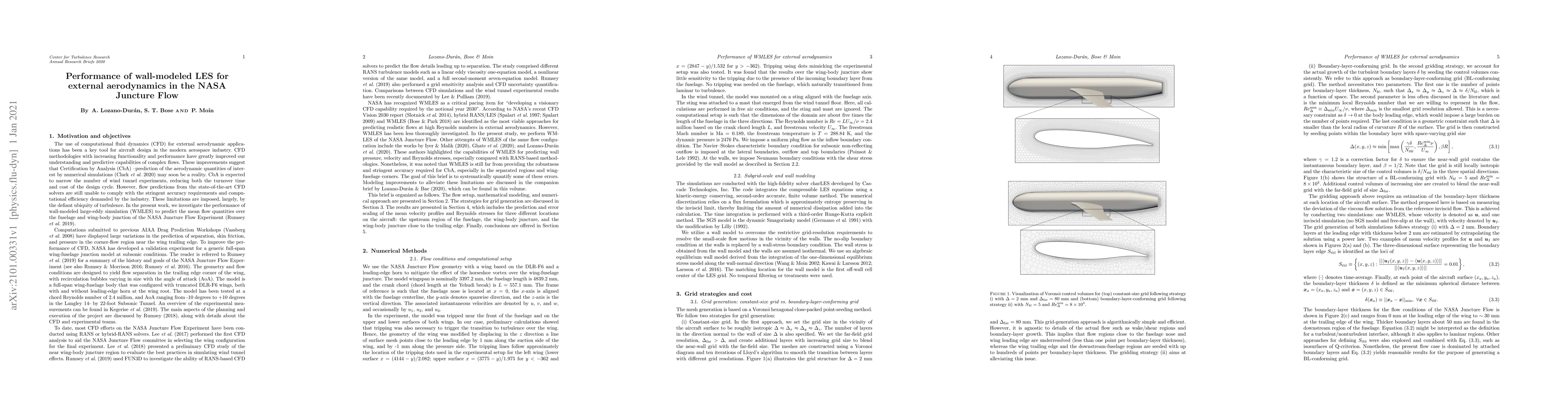 This study evaluates the performance of wall-modeled LES for external aerodynamics in the NASA Juncture Flow, finding that while it performs well in flat plate boundary layers, it struggles in regions with strong three-dimensionality and separation, especially near wing-body junctures. Boundary-layer-conforming grids show promise for more efficient grid distribution and smaller errors.