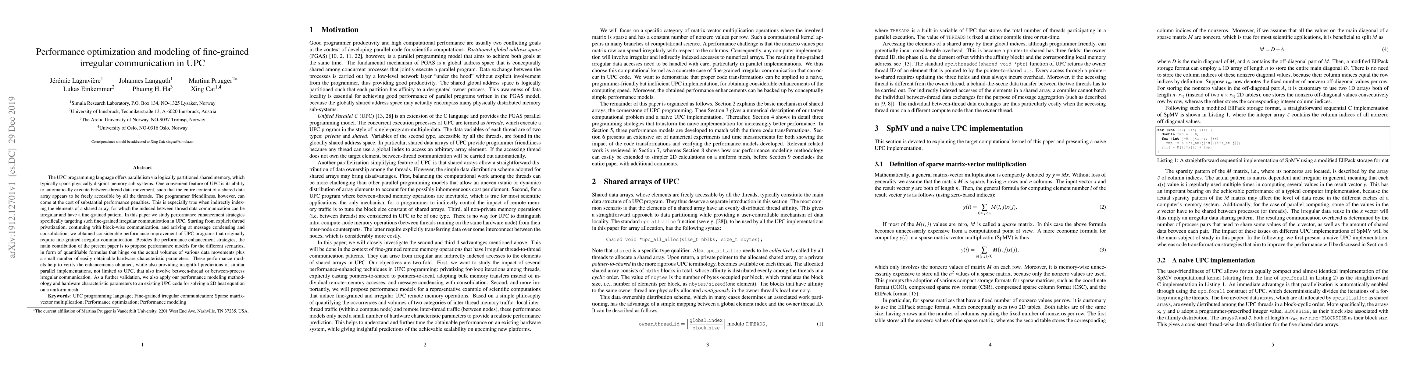This paper investigates performance optimization strategies for fine-grained irregular communication in UPC, achieving significant improvements through techniques like thread privatization, block-wise communication, and message consolidation. It also proposes performance models to quantify and predict the benefits of these enhancements.
