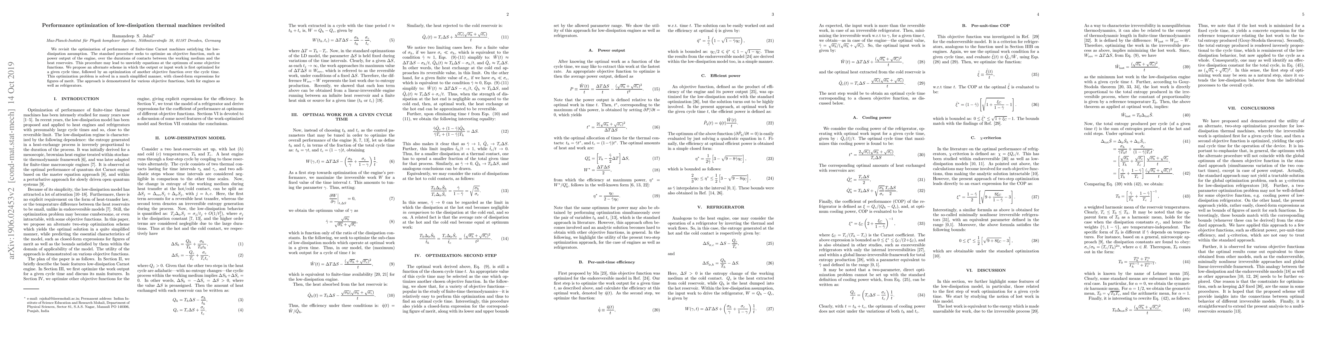 We revisit the optimization of performance of finite-time Carnot machines satisfying the low-dissipation assumption. The standard procedure seeks to optimize an objective function, such as power output of the engine, over the durations of contacts between the working medium and the heat reservoirs. This procedure may lead to unwieldy equations at the optimum of some objective functions. We propose an alternate scheme in which the output or input work is first optimized for a given cycle time, followed by an optimization of another objective function over the cycle time. The optimal behavior is thus obtained in a much simplified manner, with closed-form expressions for figures of merit. The approach is demonstrated for various objective functions, both for engines as well as refrigerators.