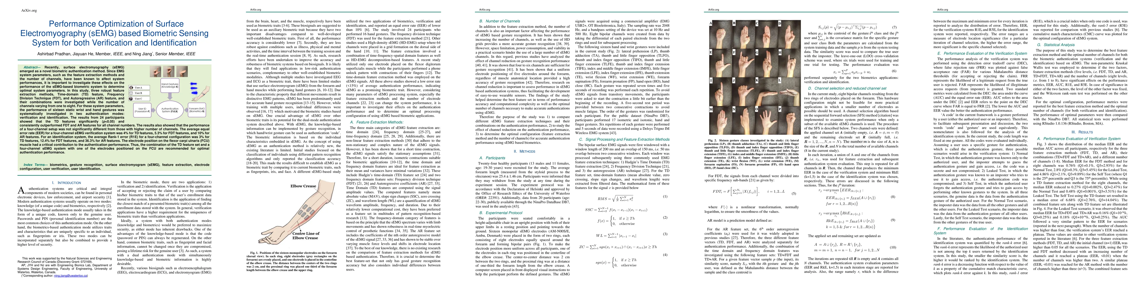 Recently, surface electromyography (sEMG) emerged as a novel biometric authentication method. Since EMG system parameters, such as the feature extraction methods and the number of channels, have been known to affect system performances, it is important to investigate these effects on the performance of the sEMG-based biometric system to determine optimal system parameters. In this study, three robust feature extraction methods, Time-domain (TD) feature, Frequency Division Technique (FDT), and Autoregressive (AR) feature, and their combinations were investigated while the number of channels varying from one to eight. For these system parameters, the performance of sixteen static wrist and hand gestures was systematically investigated in two authentication modes: verification and identification. The results from 24 participants showed that the TD features significantly (p<0.05) and consistently outperformed FDT and AR features for all channel numbers. The results also showed that the performance of a four-channel setup was not significantly different from those with higher number of channels. The average equal error rate (EER) for a four-channel sEMG verification system was 4% for TD features, 5.3% for FDT features, and 10% for AR features. For an identification system, the average Rank-1 error (R1E) for a four-channel configuration was 3% for TD features, 12.4% for FDT features, and 36.3% for AR features. The electrode position on the flexor carpi ulnaris (FCU) muscle had a critical contribution to the authentication performance. Thus, the combination of the TD feature set and a four-channel sEMG system with one of the electrodes positioned on the FCU are recommended for optimal authentication performance.