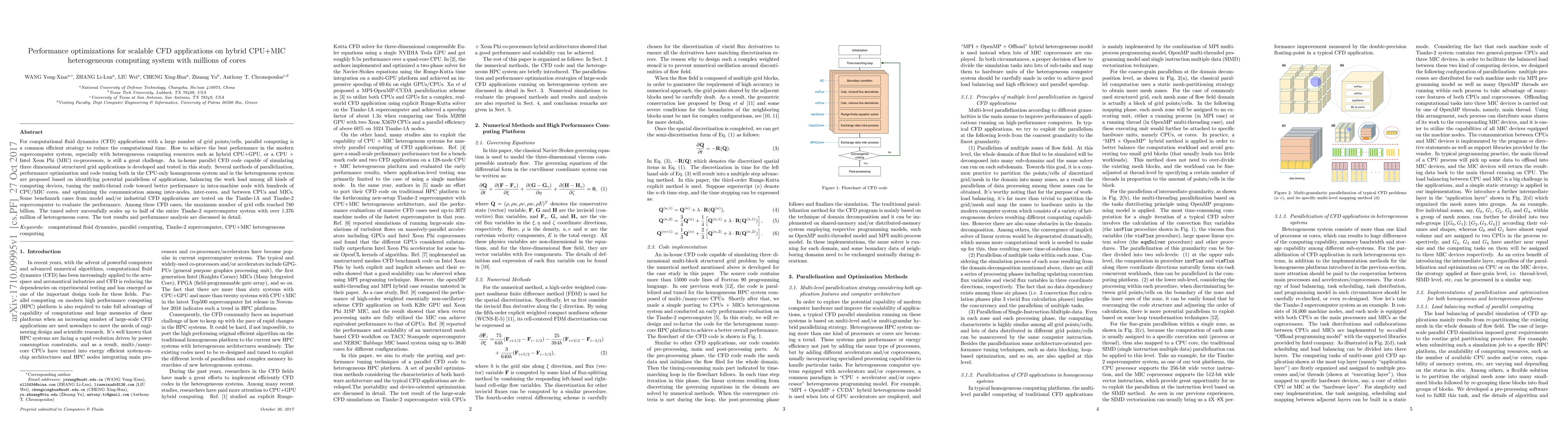 This paper develops an in-house parallel CFD code optimized for hybrid CPU+MIC systems, proposing methods for parallelization, workload balancing, and communication optimization. Benchmarks on supercomputers with millions of cores demonstrate the solver's scalability and performance, achieving optimal results on the Tianhe-2 supercomputer.