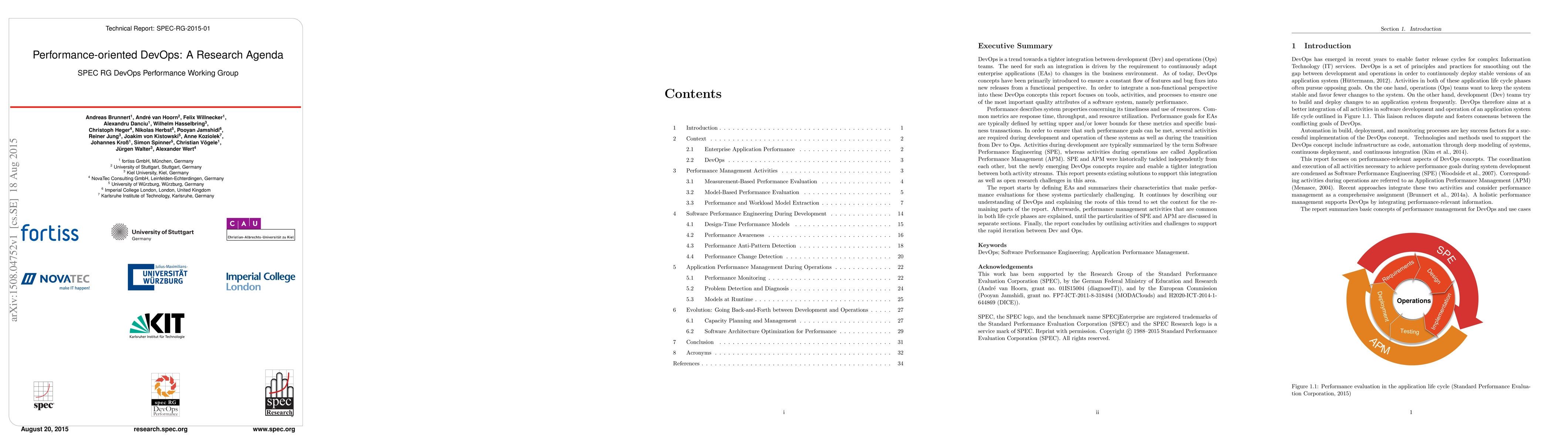 DevOps is a trend towards a tighter integration between development (Dev) and operations (Ops) teams. The need for such an integration is driven by the requirement to continuously adapt enterprise applications (EAs) to changes in the business environment. As of today, DevOps concepts have been primarily introduced to ensure a constant flow of features and bug fixes into new releases from a functional perspective. In order to integrate a non-functional perspective into these DevOps concepts this report focuses on tools, activities, and processes to ensure one of the most important quality attributes of a software system, namely performance. Performance describes system properties concerning its timeliness and use of resources. Common metrics are response time, throughput, and resource utilization. Performance goals for EAs are typically defined by setting upper and/or lower bounds for these metrics and specific business transactions. In order to ensure that such performance goals can be met, several activities are required during development and operation of these systems as well as during the transition from Dev to Ops. Activities during development are typically summarized by the term Software Performance Engineering (SPE), whereas activities during operations are called Application Performance Management (APM). SPE and APM were historically tackled independently from each other, but the newly emerging DevOps concepts require and enable a tighter integration between both activity streams. This report presents existing solutions to support this integration as well as open research challenges in this area.
