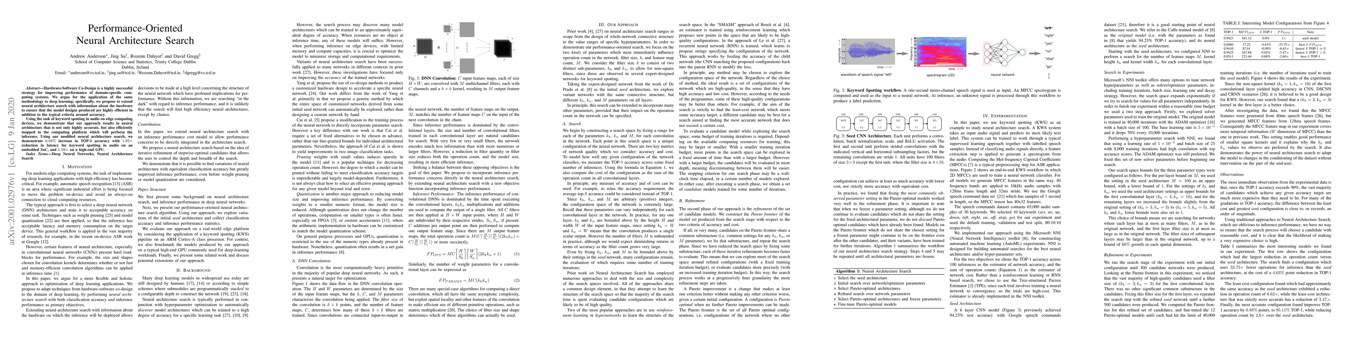 Hardware-Software Co-Design is a highly successful strategy for improving performance of domain-specific computing systems. We argue for the application of the same methodology to deep learning; specifically, we propose to extend neural architecture search with information about the hardware to ensure that the model designs produced are highly efficient in addition to the typical criteria around accuracy. Using the task of keyword spotting in audio on edge computing devices, we demonstrate that our approach results in neural architecture that is not only highly accurate, but also efficiently mapped to the computing platform which will perform the inference. Using our modified neural architecture search, we demonstrate $0.88\%$ increase in TOP-1 accuracy with $1.85\times$ reduction in latency for keyword spotting in audio on an embedded SoC, and $1.59\times$ on a high-end GPU.