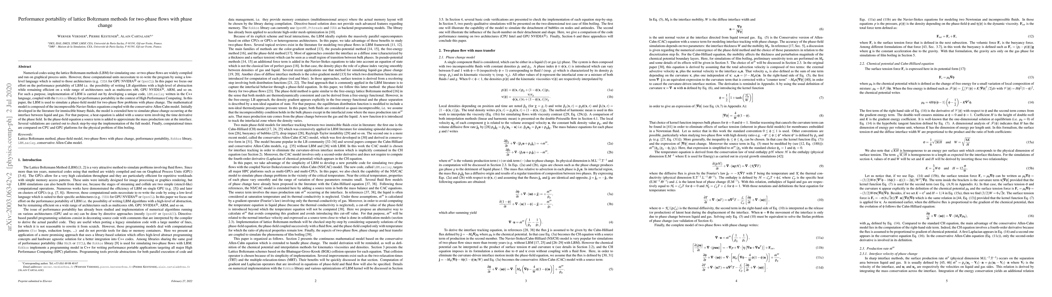 This paper explores the performance portability of Lattice Boltzmann Methods (LBM) for simulating two-phase flows with phase change, using a C++ code with the Kokkos library. It validates the extended phase-field model for liquid-gas interfaces and compares computational times on various architectures, including CPUs and GPUs.