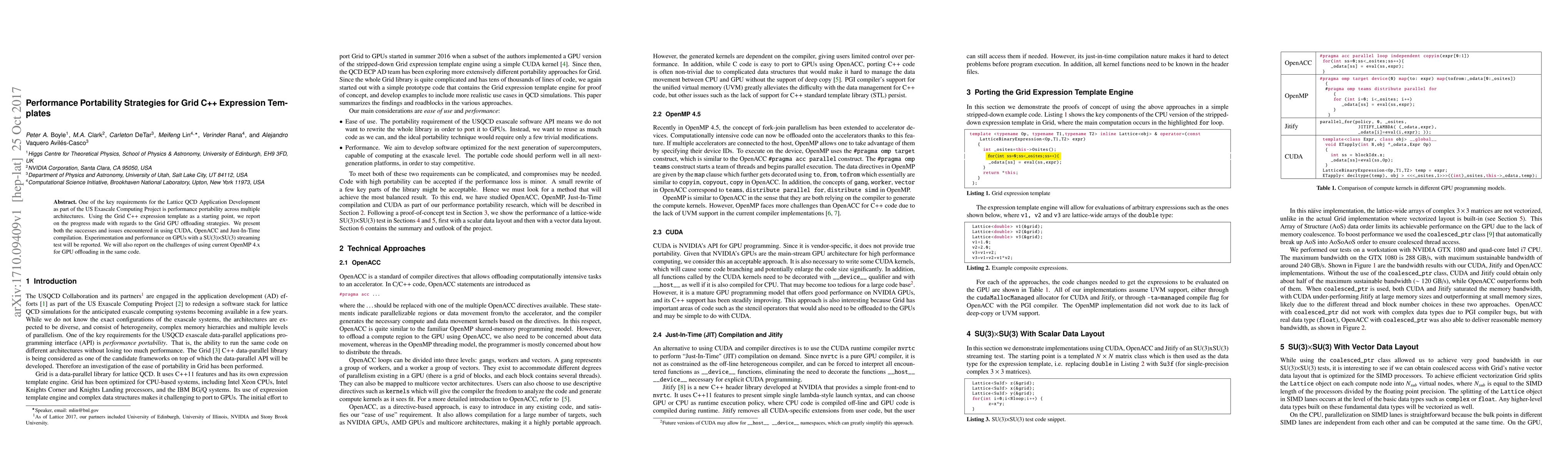 One of the key requirements for the Lattice QCD Application Development as part of the US Exascale Computing Project is performance portability across multiple architectures. Using the Grid C++ expression template as a starting point, we report on the progress made with regards to the Grid GPU offloading strategies. We present both the successes and issues encountered in using CUDA, OpenACC and Just-In-Time compilation. Experimentation and performance on GPUs with a SU(3)$\times$SU(3) streaming test will be reported. We will also report on the challenges of using current OpenMP 4.x for GPU offloading in the same code.