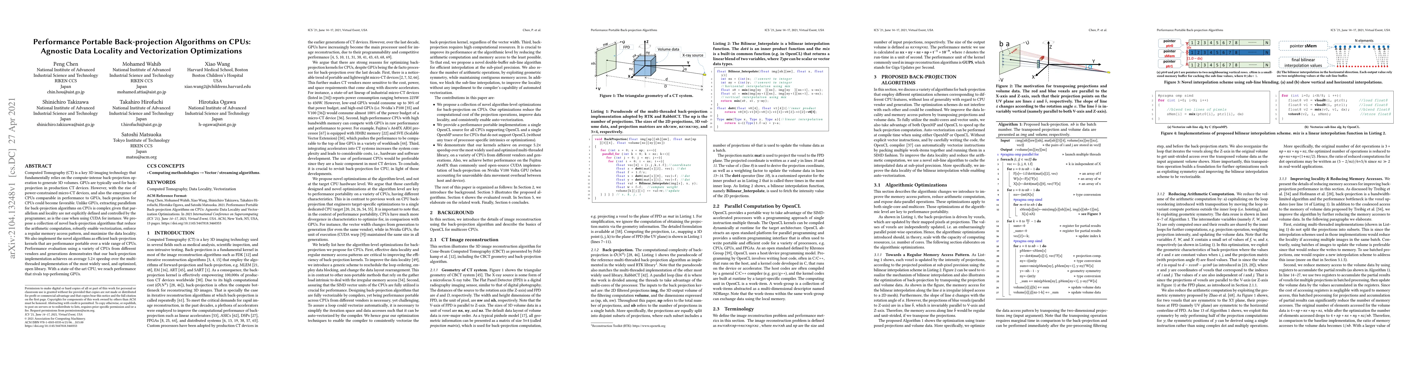 Computed Tomography (CT) is a key 3D imaging technology that fundamentally relies on the compute-intense back-projection operation to generate 3D volumes. GPUs are typically used for back-projection in production CT devices. However, with the rise of power-constrained micro-CT devices, and also the emergence of CPUs comparable in performance to GPUs, back-projection for CPUs could become favorable. Unlike GPUs, extracting parallelism for back-projection algorithms on CPUs is complex given that parallelism and locality are not explicitly defined and controlled by the programmer, as is the case when using CUDA for instance. We propose a collection of novel back-projection algorithms that reduce the arithmetic computation, robustly enable vectorization, enforce a regular memory access pattern, and maximize the data locality. We also implement the novel algorithms as efficient back-projection kernels that are performance portable over a wide range of CPUs. Performance evaluation using a variety of CPUs from different vendors and generations demonstrates that our back-projection implementation achieves on average 5.2x speedup over the multi-threaded implementation of the most widely used, and optimized, open library. With a state-of-the-art CPU, we reach performance that rivals top-performing GPUs.