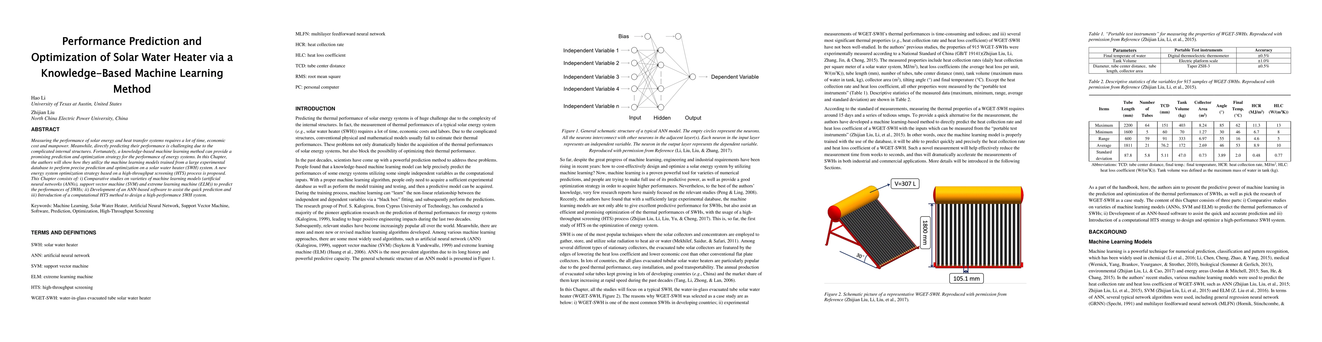 Measuring the performance of solar energy and heat transfer systems requires a lot of time, economic cost and manpower. Meanwhile, directly predicting their performance is challenging due to the complicated internal structures. Fortunately, a knowledge-based machine learning method can provide a promising prediction and optimization strategy for the performance of energy systems. In this Chapter, the authors will show how they utilize the machine learning models trained from a large experimental database to perform precise prediction and optimization on a solar water heater (SWH) system. A new energy system optimization strategy based on a high-throughput screening (HTS) process is proposed. This Chapter consists of: i) Comparative studies on varieties of machine learning models (artificial neural networks (ANNs), support vector machine (SVM) and extreme learning machine (ELM)) to predict the performances of SWHs; ii) Development of an ANN-based software to assist the quick prediction and iii) Introduction of a computational HTS method to design a high-performance SWH system.