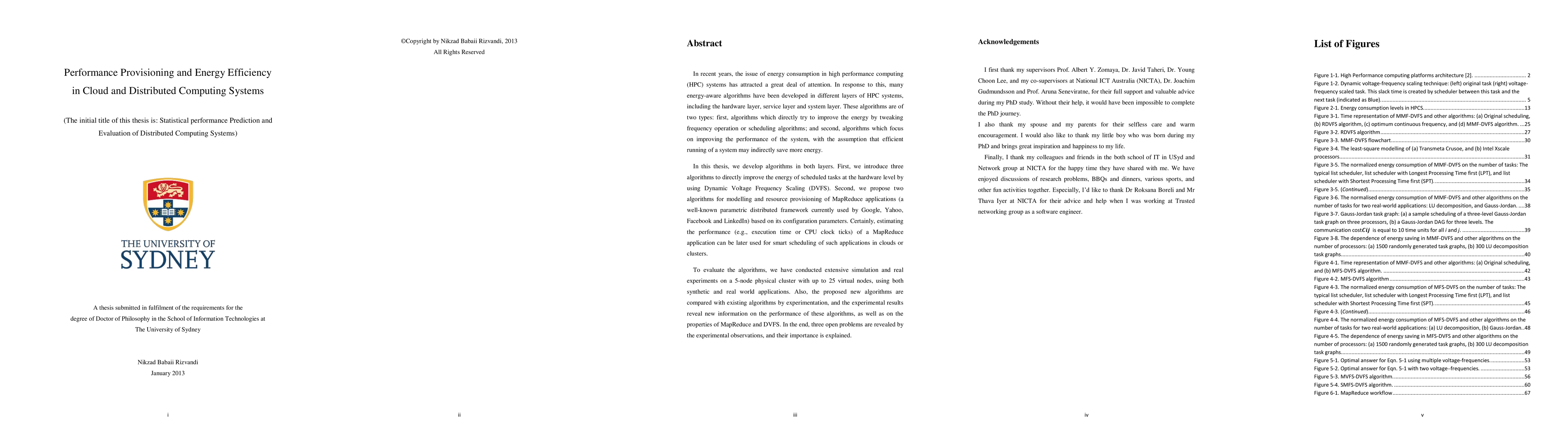 In recent years, the issue of energy consumption in high performance computing (HPC) systems has attracted a great deal of attention. In response to this, many energy-aware algorithms have been developed in different layers of HPC systems, including the hardware layer, service layer and system layer. These algorithms are of two types: first, algorithms which directly try to improve the energy by tweaking frequency operation or scheduling algorithms; and second, algorithms which focus on improving the performance of the system, with the assumption that efficient running of a system may indirectly save more energy. In this thesis, we develop algorithms in both layers. First, we introduce three algorithms to directly improve the energy of scheduled tasks at the hardware level by using Dynamic Voltage Frequency Scaling (DVFS). Second, we propose two algorithms for modelling and resource provisioning of MapReduce applications (a well-known parametric distributed framework currently used by Google, Yahoo, Facebook and LinkedIn) based on its configuration parameters. Certainly, estimating the performance (e.g., execution time or CPU clock ticks) of a MapReduce application can be later used for smart scheduling of such applications in clouds or clusters. To evaluate the algorithms, we have conducted extensive simulation and real experiments on a 5-node physical cluster with up to 25 virtual nodes, using both synthetic and real world applications. Also, the proposed new algorithms are compared with existing algorithms by experimentation, and the experimental results reveal new information on the performance of these algorithms, as well as on the properties of MapReduce and DVFS. In the end, three open problems are revealed by the experimental observations, and their importance is explained.