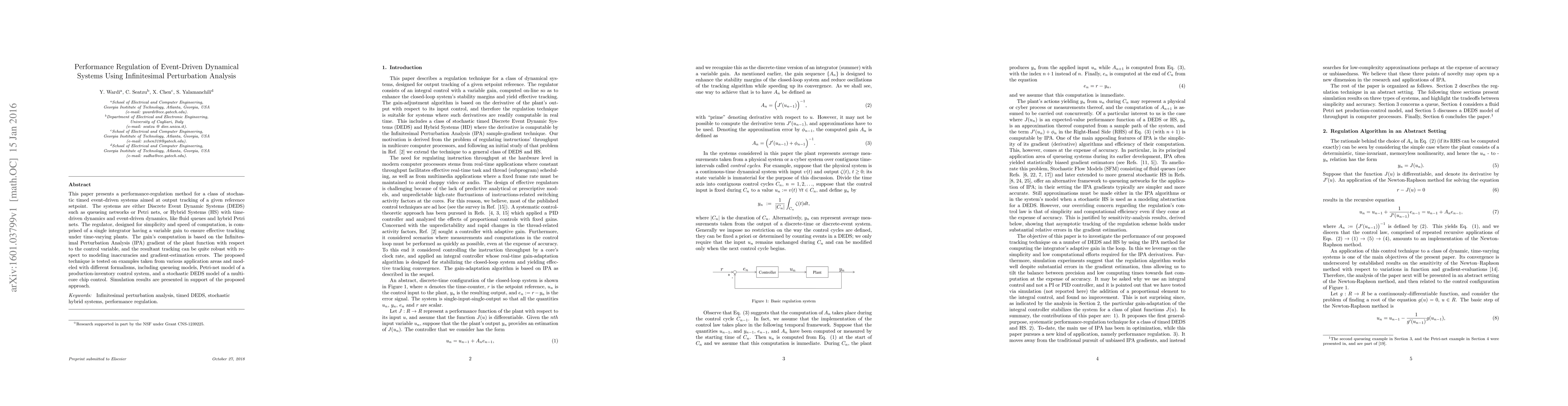 This paper presents a performance-regulation method for a class of stochastic timed event-driven systems aimed at output tracking of a given reference setpoint. The systems are either Discrete Event Dynamic Systems (DEDS) such as queueing networks or Petri nets, or Hybrid Systems (HS) with time-driven dynamics and event-driven dynamics, like fluid queues and hybrid Petri nets. The regulator, designed for simplicity and speed of computation, is comprised of a single integrator having a variable gain to ensure effective tracking under time-varying plants. The gain's computation is based on the Infinitesimal Perturbation Analysis (IPA) gradient of the plant function with respect to the control variable, and the resultant tracking can be quite robust with respect to modeling inaccuracies and gradient-estimation errors. The proposed technique is tested on examples taken from various application areas and modeled with different formalisms, including queueing models, Petri-net model of a production-inventory control system, and a stochastic DEDS model of a multicore chip control. Simulation results are presented in support of the proposed approach.