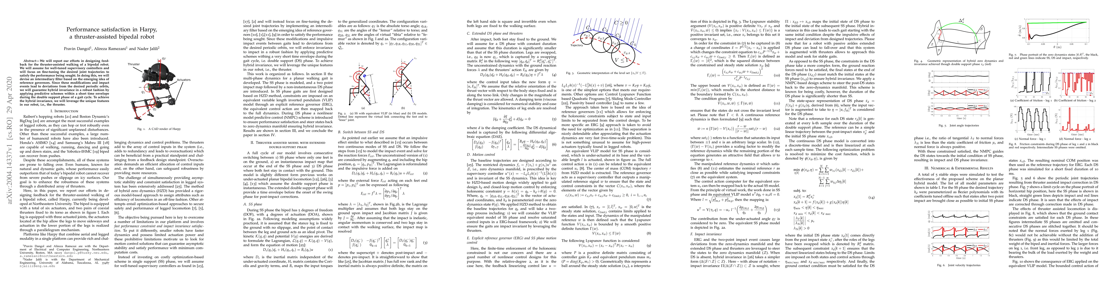 We will report our efforts in designing feedback for the thruster-assisted walking of a bipedal robot. We will assume for well-tuned supervisory controllers and will focus on fine-tuning the desired joint trajectories to satisfy the performance being sought. In doing this, we will devise an intermediary filter based on the emerging idea of reference governors. Since these modifications and impact events lead to deviations from the desired periodic orbits, we will guarantee hybrid invariance in a robust fashion by applying predictive schemes within a short time envelope during the double support phase of a gait cycle. To achieve the hybrid invariance, we will leverage the unique features in our robot, i.e., the thruster.