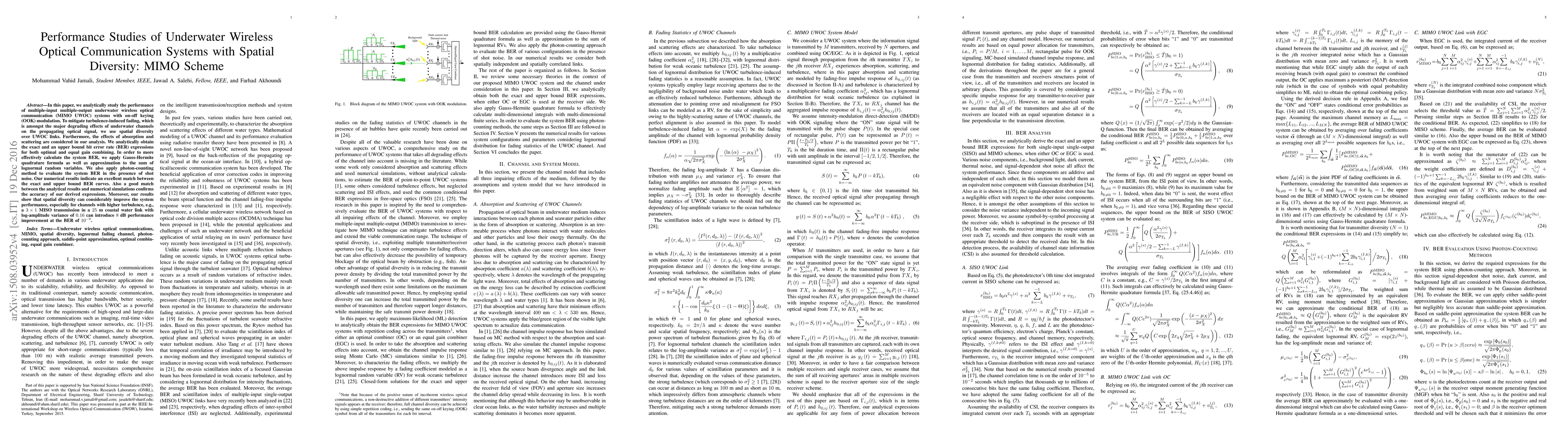 This paper analytically studies the performance of MIMO underwater wireless optical communication systems using OOK modulation, focusing on spatial diversity to mitigate turbulence-induced fading. The study derives exact and upper bound BER expressions, confirming their accuracy through numerical simulations and showing significant performance improvements, especially in turbulent channels.