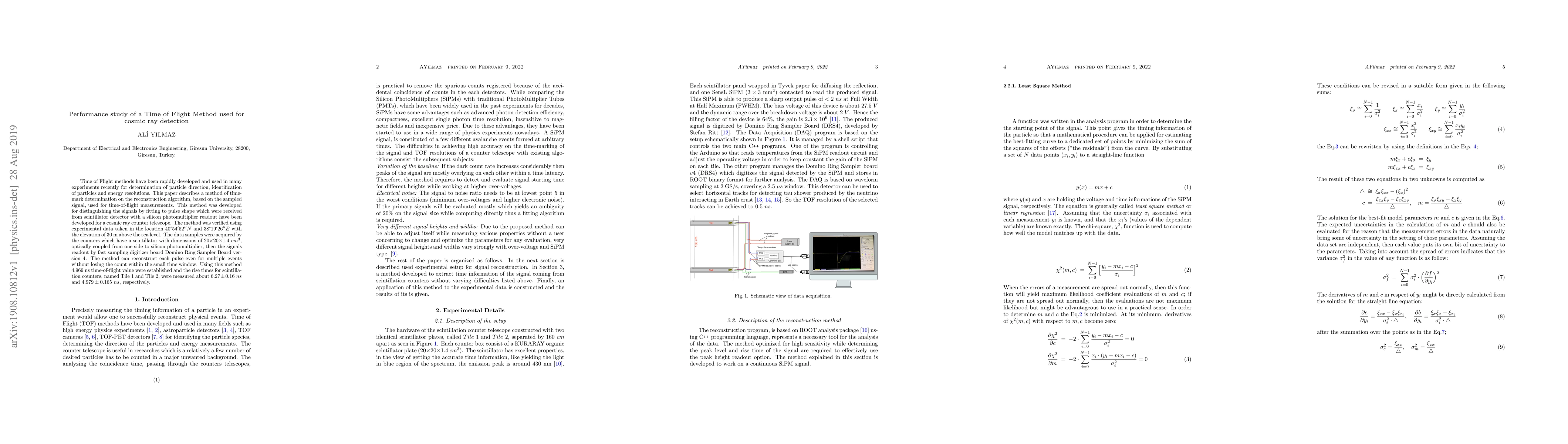 This paper presents a time-of-flight method for cosmic ray detection using a reconstruction algorithm based on sampled signals to determine time marks. The method, tested in a specific location, successfully distinguishes signals from scintillator detectors with a silicon photomultiplier, achieving a time-of-flight value of 4.969 ns and measuring rise times for the scintillation counters.