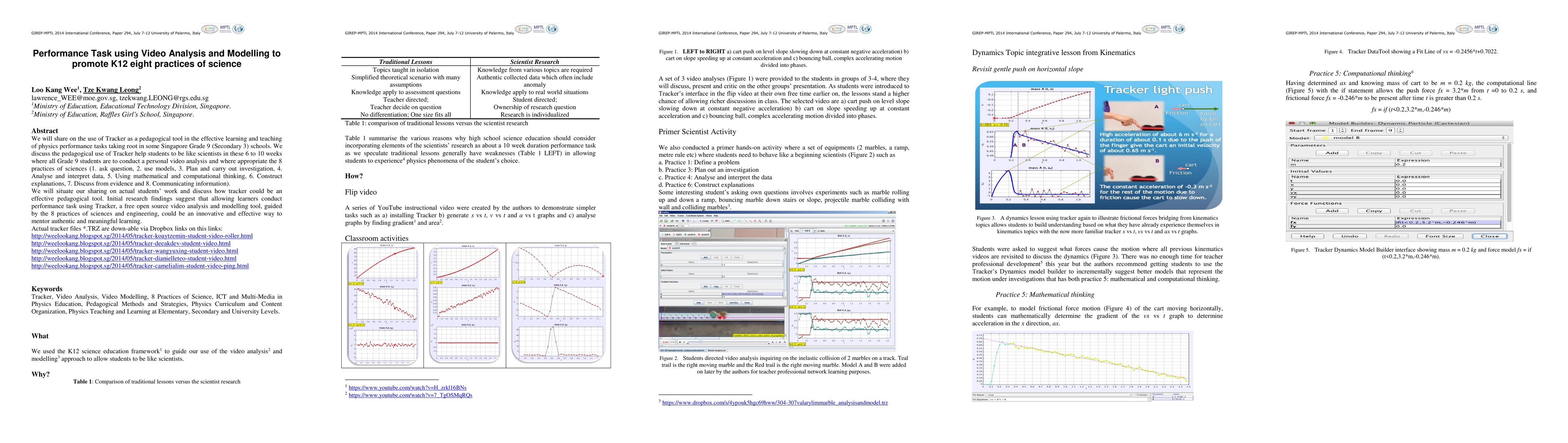 We will share on the use of Tracker as a pedagogical tool in the effective learning and teaching of physics performance tasks taking root in some Singapore Grade 9 (Secondary 3) schools. We discuss the pedagogical use of Tracker help students to be like scientists in these 6 to 10 weeks where all Grade 9 students are to conduct a personal video analysis and where appropriate the 8 practices of sciences (1. ask question, 2. use models, 3. Plan and carry out investigation, 4. Analyse and interpret data, 5. Using mathematical and computational thinking, 6. Construct explanations, 7. Discuss from evidence and 8. Communicating information). We will situate our sharing on actual students work and discuss how tracker could be an effective pedagogical tool. Initial research findings suggest that allowing learners conduct performance task using Tracker, a free open source video analysis and modelling tool, guided by the 8 practices of sciences and engineering, could be an innovative and effective way to mentor authentic and meaningful learning.