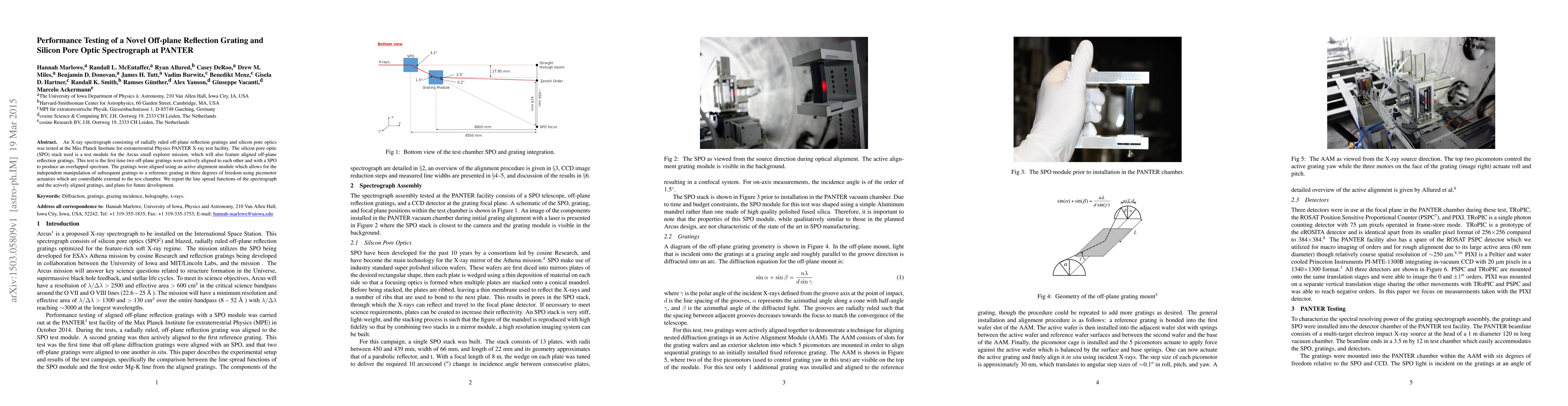 This paper reports on the performance testing of a novel X-ray spectrograph combining off-plane reflection gratings and silicon pore optics at PANTER. For the first time, two off-plane gratings were actively aligned and combined with a silicon pore optic stack, producing an overlapped spectrum.