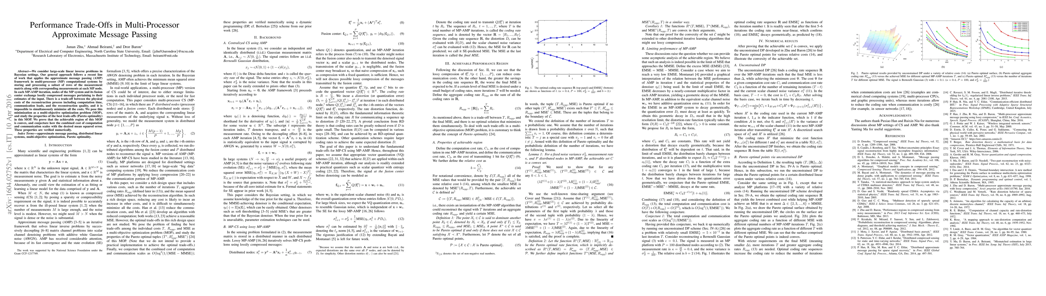 This paper investigates the performance trade-offs in multi-processor implementations of approximate message passing for large-scale linear inverse problems. It formulates the optimization of computation time, communication loads, and reconstruction quality as a multi-objective optimization problem, proving its convexity and analyzing the scaling of combined costs with error.