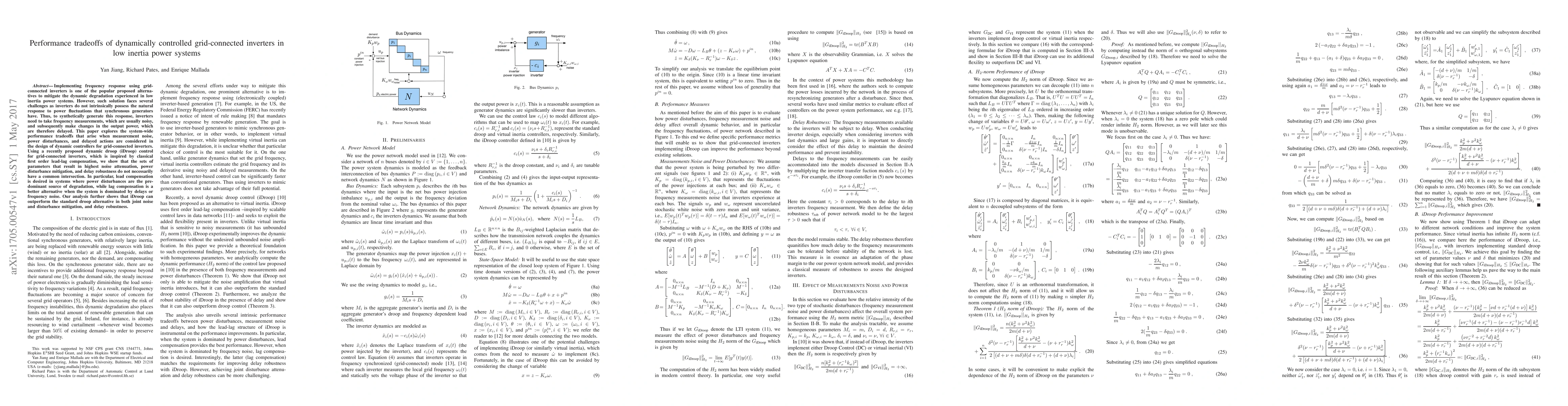 This paper investigates the performance tradeoffs of dynamically controlled grid-connected inverters in low inertia power systems, highlighting the challenges of noisy frequency measurements and delayed power responses. The study finds that optimal parameter settings for noise attenuation, power disturbance mitigation, and delay robustness do not overlap, suggesting that lead compensation is better for disturbance-dominated systems, while lag compensation suits delay-dominated systems.