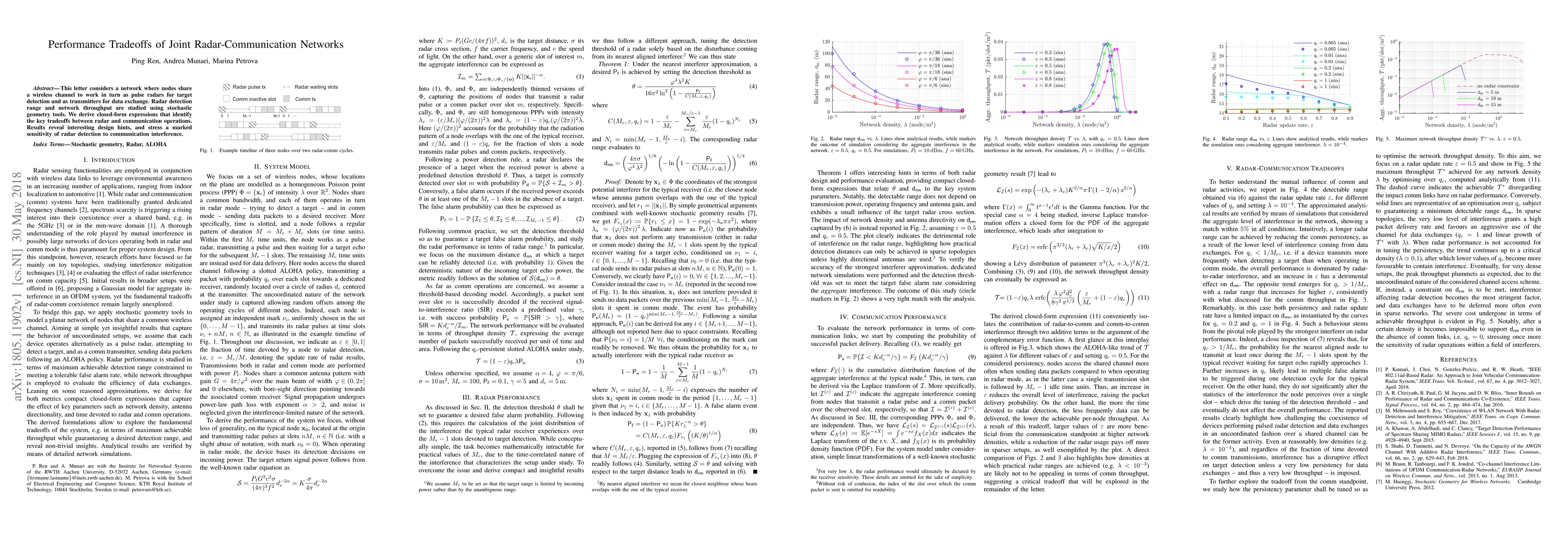 This paper investigates the performance tradeoffs in networks using shared wireless channels for radar and communication. It employs stochastic geometry to derive expressions highlighting the balance between radar detection range and network throughput, revealing significant sensitivity of radar to communication interference.
