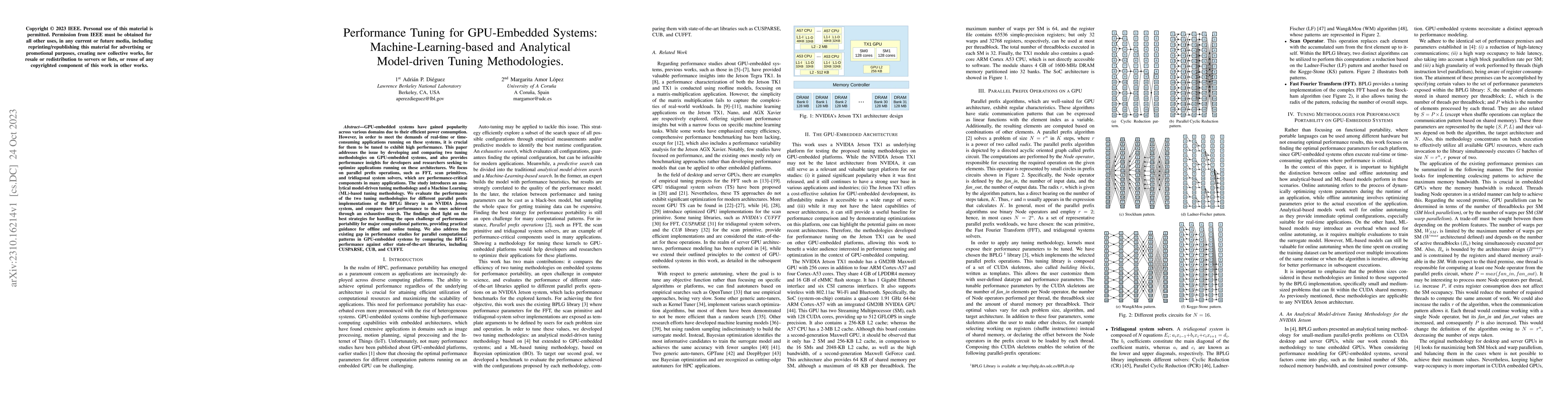 This paper develops and compares two performance tuning methodologies for GPU-embedded systems: an analytical model-driven approach and a Machine Learning-based method. The study evaluates their effectiveness on parallel prefix operations in the BPLG library on an NVIDIA Jetson system, providing insights for optimizing application performance.