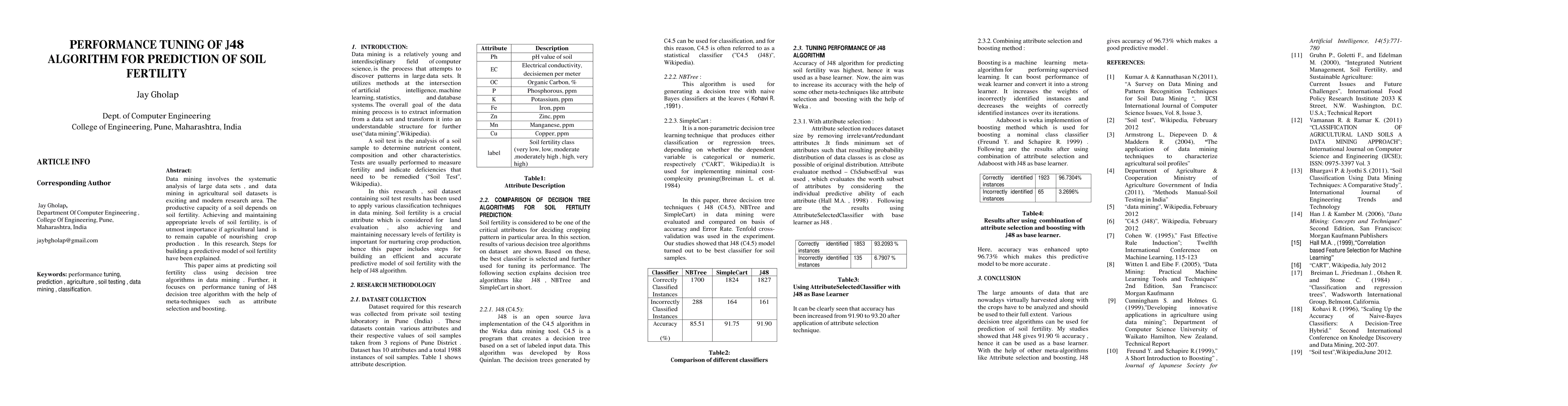 This paper uses a decision tree algorithm called J48 to predict soil fertility based on various factors, and tunes its performance using techniques like attribute selection and boosting to improve accuracy.