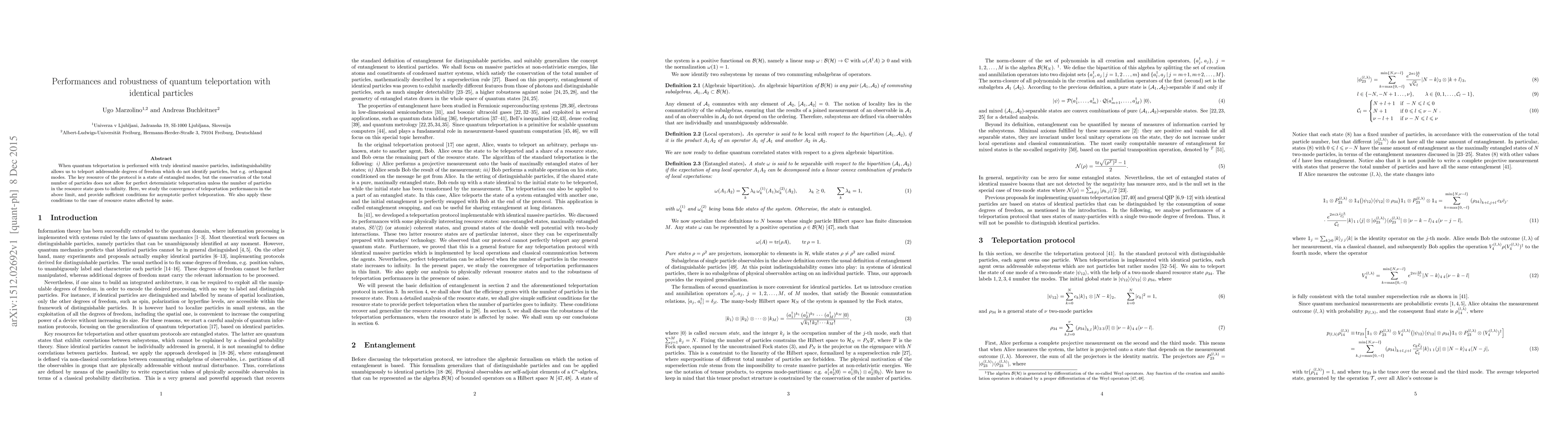 The paper presents a detailed analysis of quantum teleportation with identical particles, deriving conditions for asymptotically perfect teleportation and studying the robustness of teleportation performances against noise, generalizing previous work to a broader class of resource states.