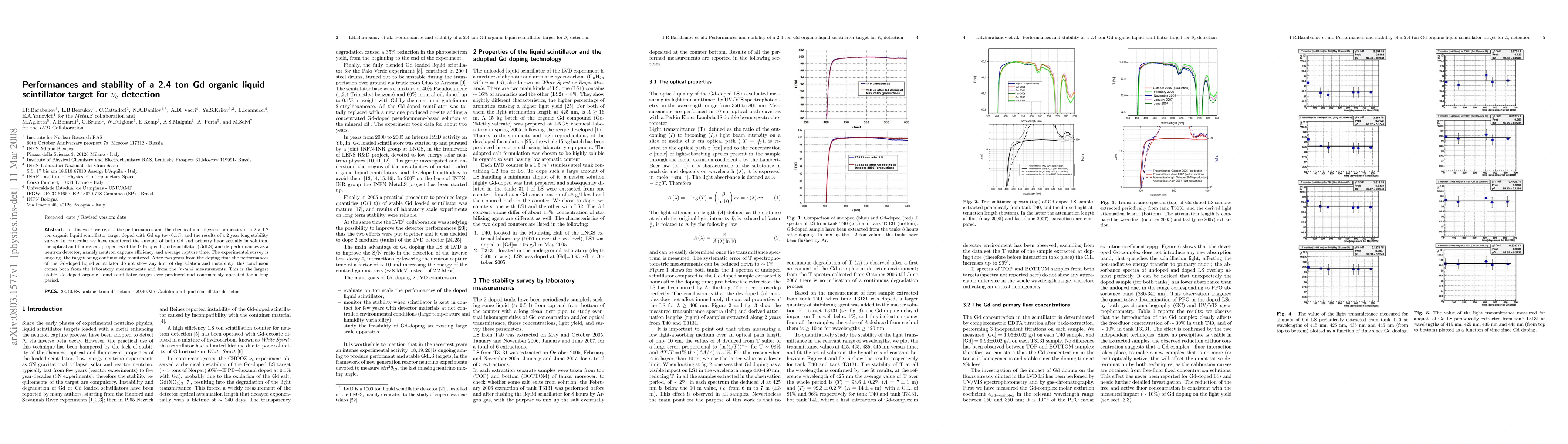 This paper reports on the performance and stability of a 2.4-ton Gd-doped organic liquid scintillator target used for antineutrino detection, showing no degradation after two years of monitoring, and highlighting its efficiency as a neutron detector. The stability and properties of the Gd-doped liquid scintillator are maintained over time, marking it as the largest stable target of its kind.