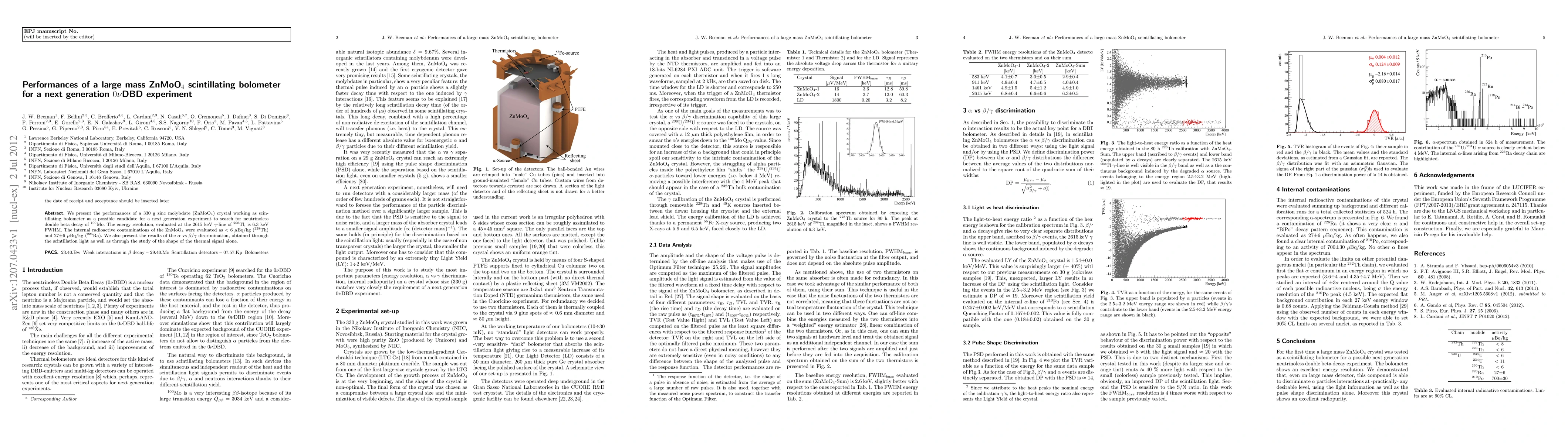 Researchers tested a large zinc molybdate crystal as a scintillating bolometer for detecting neutrinoless double beta decay, achieving an energy resolution of 6.3 keV FWHM and low internal radioactivity.