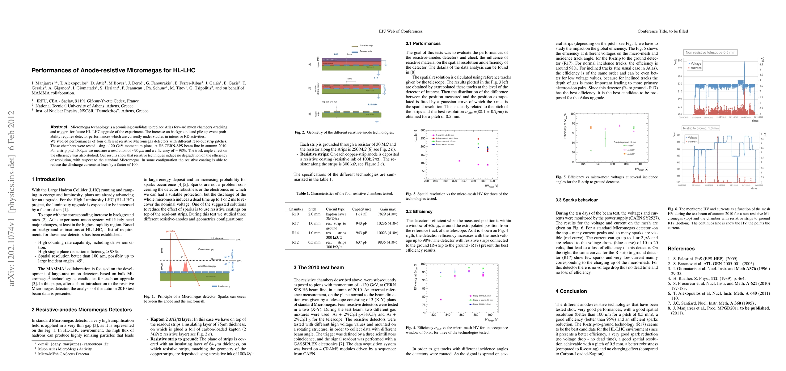 Micromegas technology is a promising candidate to replace Atlas forward muon chambers -tracking and trigger- for future HL-LHC upgrade of the experiment. The increase on background and pile-up event probability requires detector performances which are currently under studies in intensive RD activities. We studied performances of four different resistive Micromegas detectors with different read-out strip pitches. These chambers were tested using \sim120 GeV momentum pions, at H6 CERN-SPS beam line in autumn 2010. For a strip pitch 500 micrometers we measure a resolution of \sim90 micrometers and a efficiency of ~98%. The track angle effect on the efficiency was also studied. Our results show that resistive techniques induce no degradation on the efficiency or resolution, with respect to the standard Micromegas. In some configuration the resistive coating is able to reduce the discharge currents at least by a factor of 100.Micromegas technology is a promising candidate to replace Atlas forward muon chambers -tracking and trigger- for future HL-LHC upgrade of the experiment. The increase on background and pile-up event probability requires detector performances which are currently under studies in intensive RD activities. We studied performances of four different resistive Micromegas detectors with different read-out strip pitches. These chambers were tested using \sim120 GeV momentum pions, at H6 CERN-SPS beam line in autumn 2010. For a strip pitch 500 micrometers we measure a resolution of \sim90 micrometers and a efficiency of \sim98%. The track angle effect on the efficiency was also studied. Our results show that resistive techniques induce no degradation on the efficiency or resolution, with respect to the standard Micromegas. In some configuration the resistive coating is able to reduce the discharge currents at least by a factor of 100.