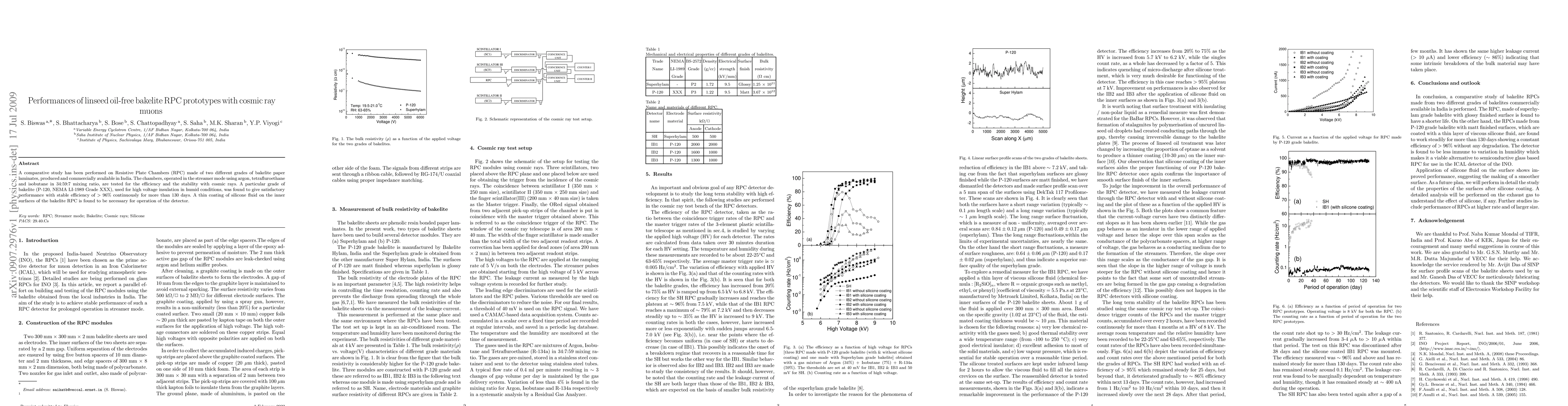 This study compares the performance of Resistive Plate Chambers (RPC) made from two different grades of bakelite paper laminates, finding that P-120 bakelite, used for high voltage insulation, maintains stable efficiency over 96% for over 130 days when exposed to cosmic rays, with a thin silicone fluid coating on the inner surfaces enhancing detector operation.