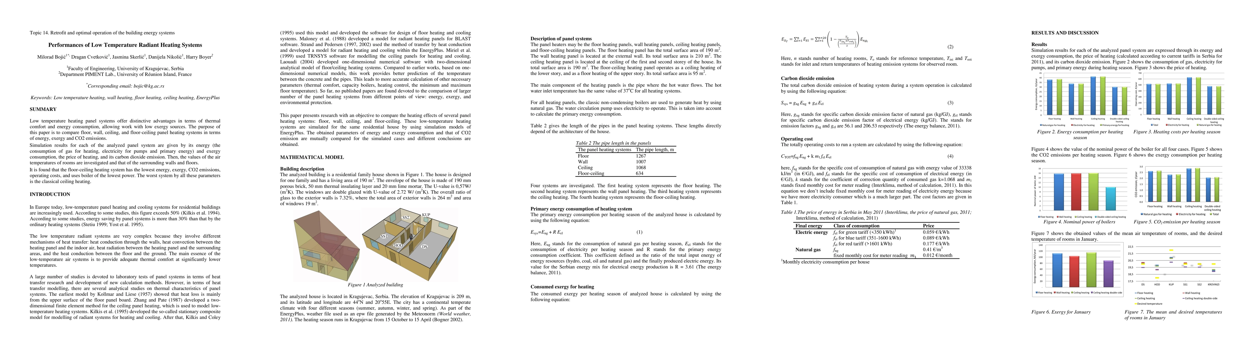 Low temperature heating panel systems offer distinctive advantages in terms of thermal comfort and energy consumption, allowing work with low exergy sources. The purpose of this paper is to compare floor, wall, ceiling, and floor-ceiling panel heating systems in terms of energy, exergy and CO2 emissions. Simulation results for each of the analyzed panel system are given by its energy (the consumption of gas for heating, electricity for pumps and primary energy) and exergy consumption, the price of heating, and its carbon dioxide emission. Then, the values of the air temperatures of rooms are investigated and that of the surrounding walls and floors. It is found that the floor-ceiling heating system has the lowest energy, exergy, CO2 emissions, operating costs, and uses boiler of the lowest power. The worst system by all these parameters is the classical ceiling heating