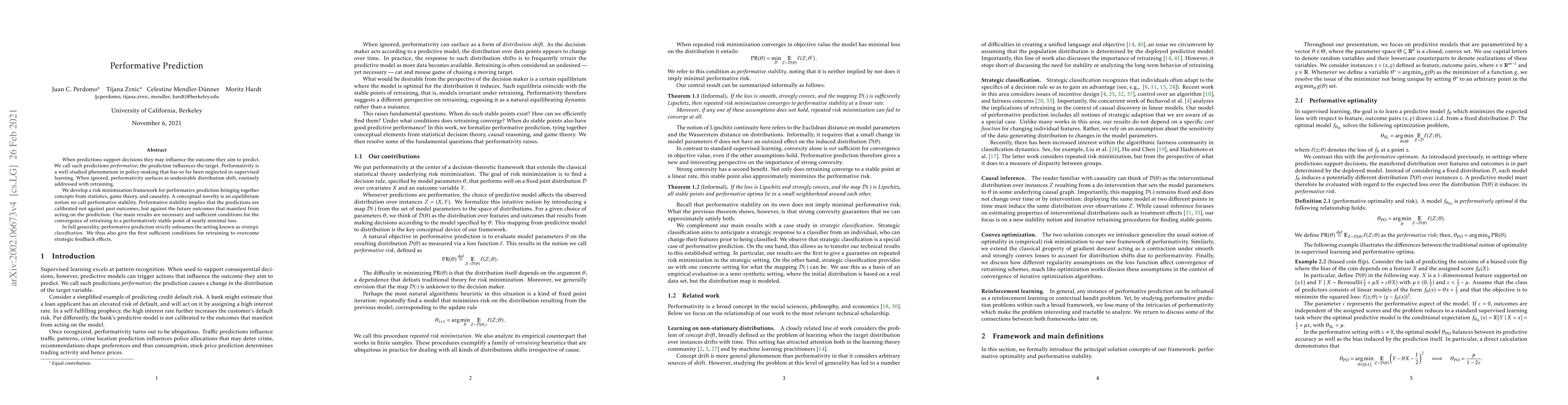 When predictions support decisions they may influence the outcome they aim to predict. We call such predictions performative; the prediction influences the target. Performativity is a well-studied phenomenon in policy-making that has so far been neglected in supervised learning. When ignored, performativity surfaces as undesirable distribution shift, routinely addressed with retraining. We develop a risk minimization framework for performative prediction bringing together concepts from statistics, game theory, and causality. A conceptual novelty is an equilibrium notion we call performative stability. Performative stability implies that the predictions are calibrated not against past outcomes, but against the future outcomes that manifest from acting on the prediction. Our main results are necessary and sufficient conditions for the convergence of retraining to a performatively stable point of nearly minimal loss. In full generality, performative prediction strictly subsumes the setting known as strategic classification. We thus also give the first sufficient conditions for retraining to overcome strategic feedback effects.