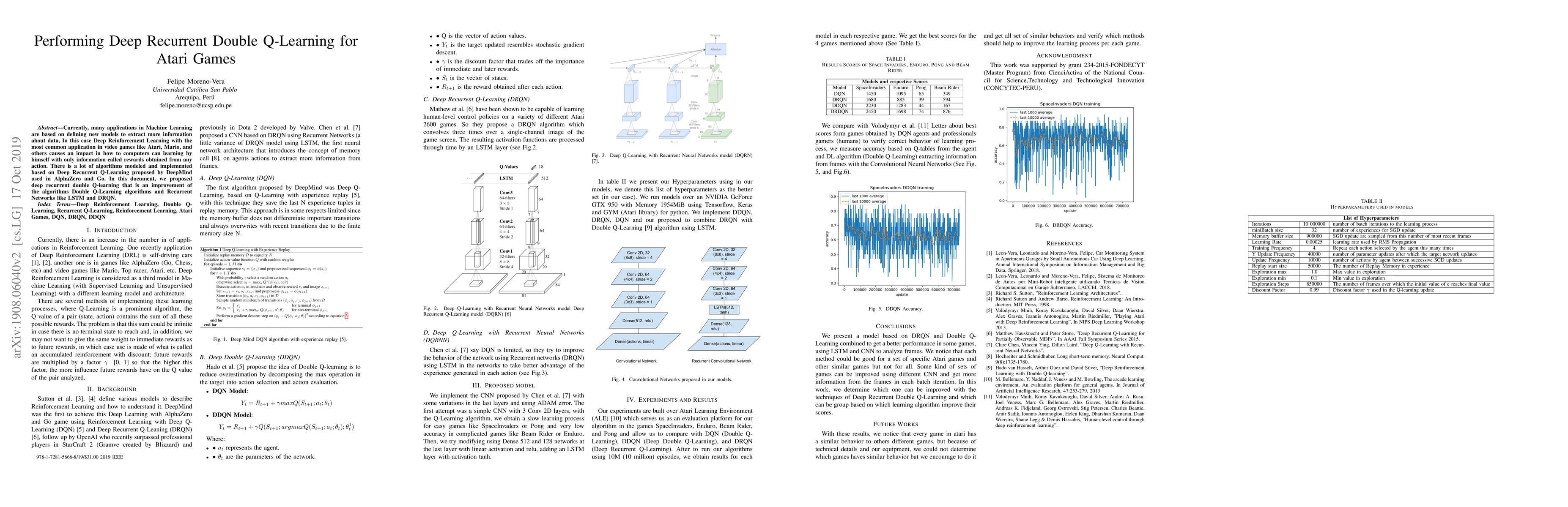 Currently, many applications in Machine Learning are based on define new models to extract more information about data, In this case Deep Reinforcement Learning with the most common application in video games like Atari, Mario, and others causes an impact in how to computers can learning by himself with only information called rewards obtained from any action. There is a lot of algorithms modeled and implemented based on Deep Recurrent Q-Learning proposed by DeepMind used in AlphaZero and Go. In this document, We proposed Deep Recurrent Double Q-Learning that is an implementation of Deep Reinforcement Learning using Double Q-Learning algorithms and Recurrent Networks like LSTM and DRQN.