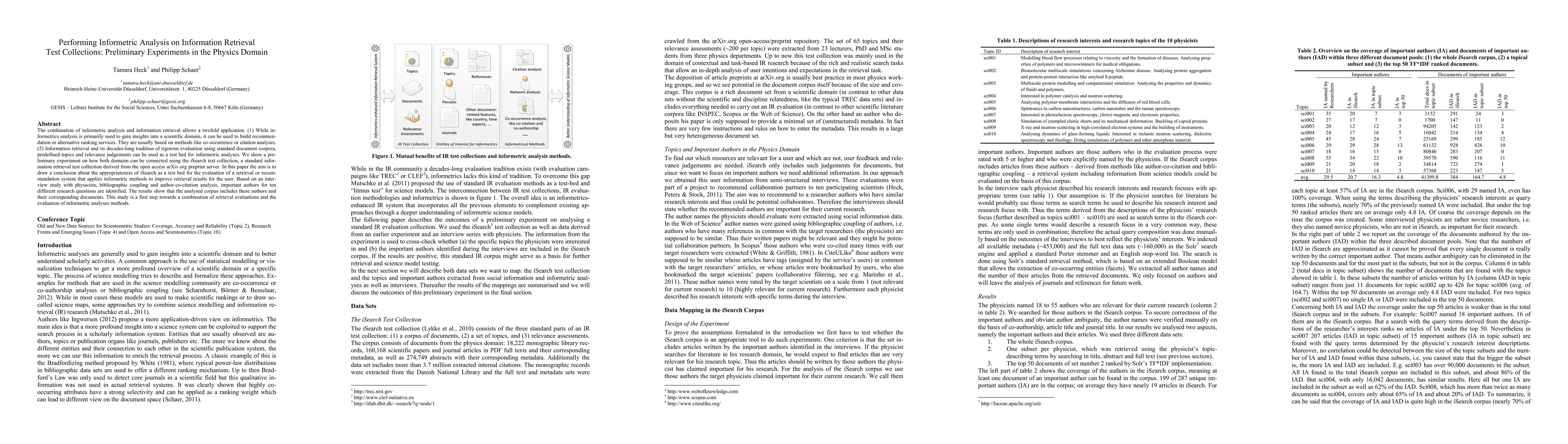The combination of informetric analysis and information retrieval allows a twofold application. (1) While in-formetrics analysis is primarily used to gain insights into a scientific domain, it can be used to build recommen-dation or alternative ranking services. They are usually based on methods like co-occurrence or citation analyses. (2) Information retrieval and its decades-long tradition of rigorous evaluation using standard document corpora, predefined topics and relevance judgements can be used as a test bed for informetric analyses. We show a preliminary experiment on how both domains can be connected using the iSearch test collection, a standard information retrieval test collection derived from the open access arXiv.org preprint server. In this paper the aim is to draw a conclusion about the appropriateness of iSearch as a test bed for the evaluation of a retrieval or recommendation system that applies informetric methods to improve retrieval results for the user. Based on an interview study with physicists, bibliographic coupling and author-co-citation analysis, important authors for ten different research questions are identified. The results show that the analysed corpus includes these authors and their corresponding documents. This study is a first step towards a combination of retrieval evaluations and the evaluation of informetric analyses methods.