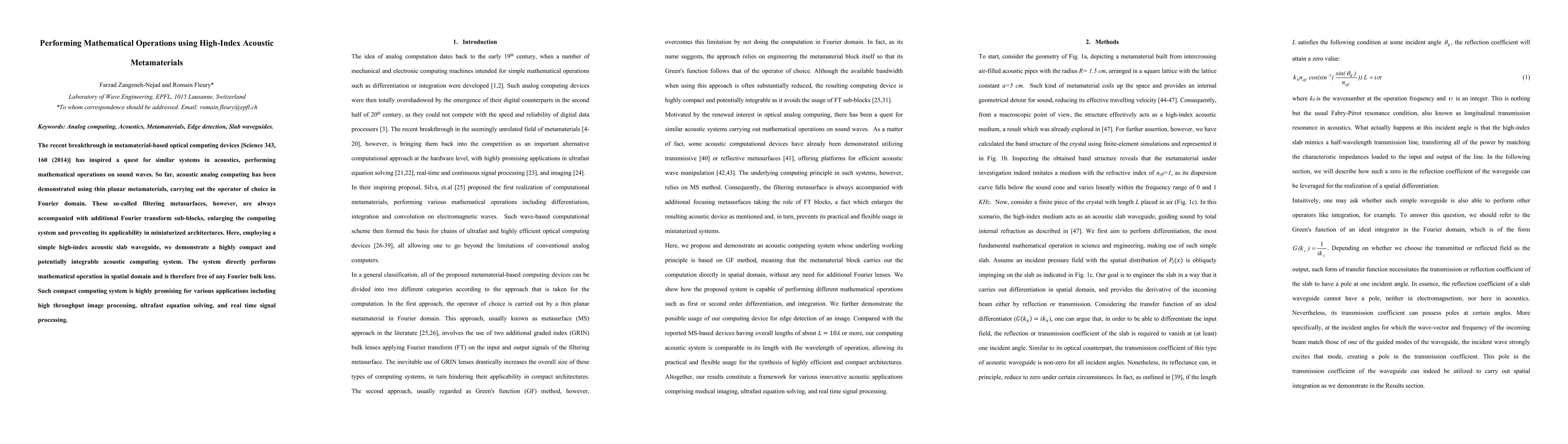 This paper demonstrates a compact acoustic computing system using high-index metamaterials that directly performs mathematical operations in the spatial domain, eliminating the need for Fourier transform sub-blocks. This innovation promises miniaturized architectures suitable for applications like high-throughput image processing and real-time signal processing.