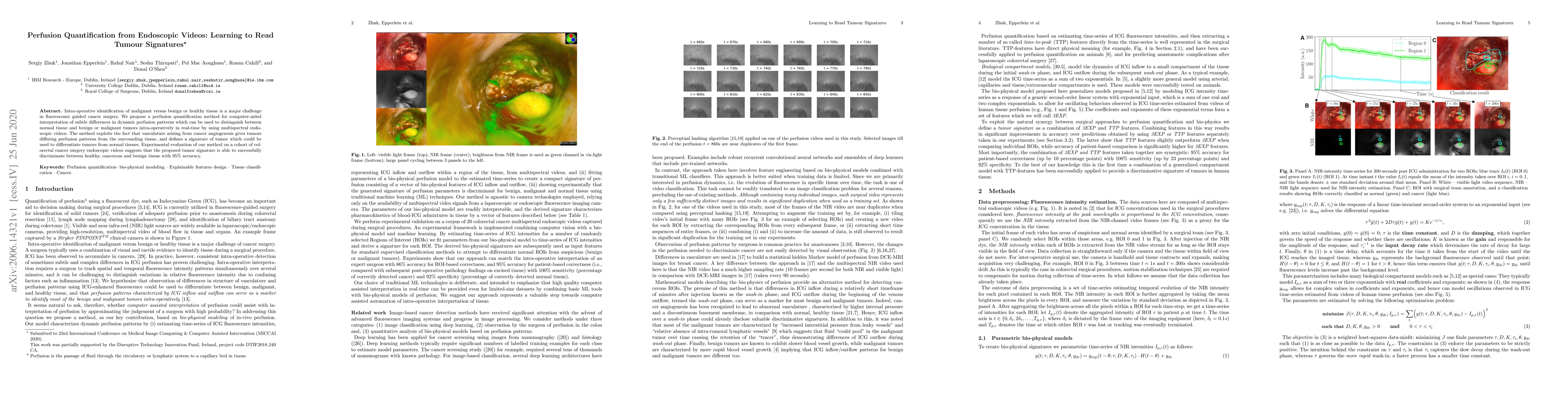Intra-operative identification of malignant versus benign or healthy tissue is a major challenge in fluorescence guided cancer surgery. We propose a perfusion quantification method for computer-aided interpretation of subtle differences in dynamic perfusion patterns which can be used to distinguish between normal tissue and benign or malignant tumors intra-operatively in real-time by using multispectral endoscopic videos. The method exploits the fact that vasculature arising from cancer angiogenesis gives tumors differing perfusion patterns from the surrounding tissue, and defines a signature of tumor which could be used to differentiate tumors from normal tissues. Experimental evaluation of our method on a cohort of colorectal cancer surgery endoscopic videos suggests that the proposed tumor signature is able to successfully discriminate between healthy, cancerous and benign tissue with 95% accuracy.