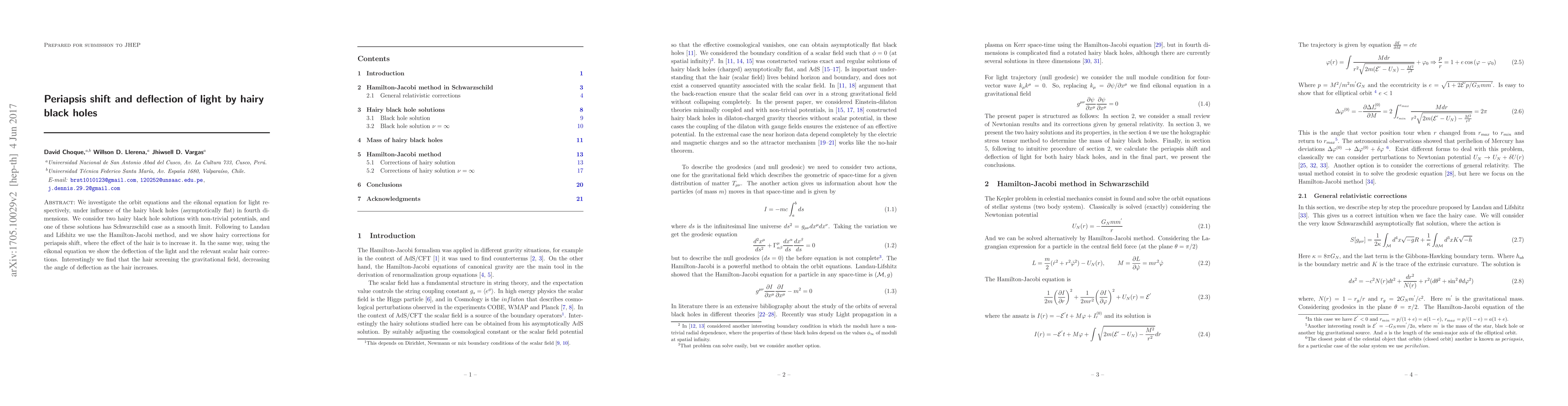 We investigate the orbit equations and the eikonal equation for light respectively, under influence of the hairy black holes (asymptotically flat) in four dimensions. We consider two hairy black hole solutions with non-trivial potentials, and one of these solutions has Schwarzschild case as a smooth limit. Following to Landau and Lifshitz, we use the Hamilton-Jacobi method, and we show hairy corrections for periapsis shift, where the effect of the hair is to increase it. In the same way, using the eikonal equation we show the deflection of the light and the relevant scalar hair corrections. Interestingly we find that the hair screening the gravitational field, decreasing the angle of deflection as the hair increases.