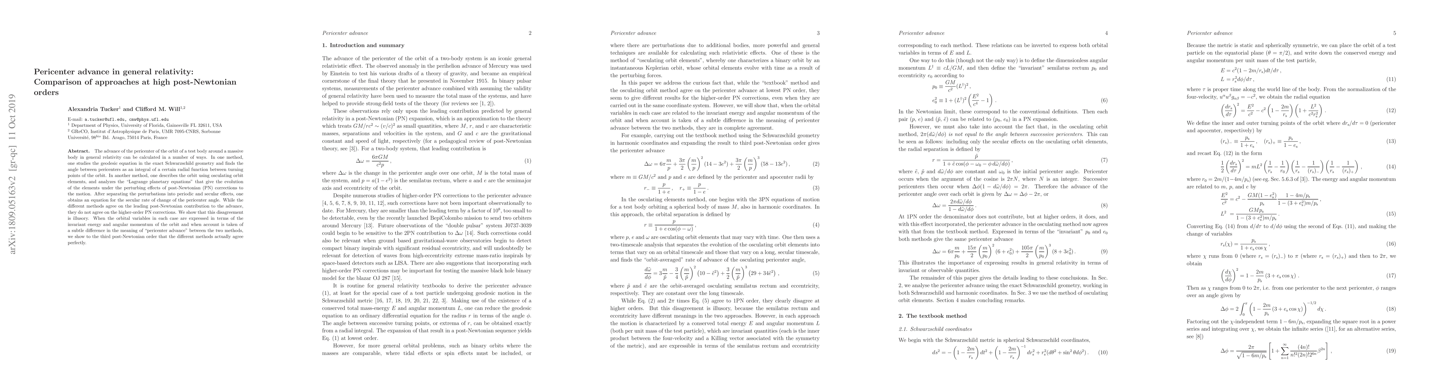 The advance of the pericenter of the orbit of a test body around a massive body in general relativity can be calculated in a number of ways. In one method, one studies the geodesic equation in the exact Schwarzschild geometry and finds the angle between pericenters as an integral of a certain radial function between turning points of the orbit. In another method, one describes the orbit using osculating orbit elements, and analyzes the "Lagrange planetary equations" that give the evolution of the elements under the perturbing effects of post-Newtonian (PN) corrections to the motion. After separating the perturbations into periodic and secular effects, one obtains an equation for the secular rate of change of the pericenter angle. While the different methods agree on the leading post-Newtonian contribution to the advance, they do not agree on the higher-order PN corrections. We show that this disagreement is illusory. When the orbital variables in each case are expressed in terms of the invariant energy and angular momentum of the orbit and when account is taken of a subtle difference in the meaning of "pericenter advance" between the two methods, we show to the third post-Newtonian order that the different methods actually agree perfectly.