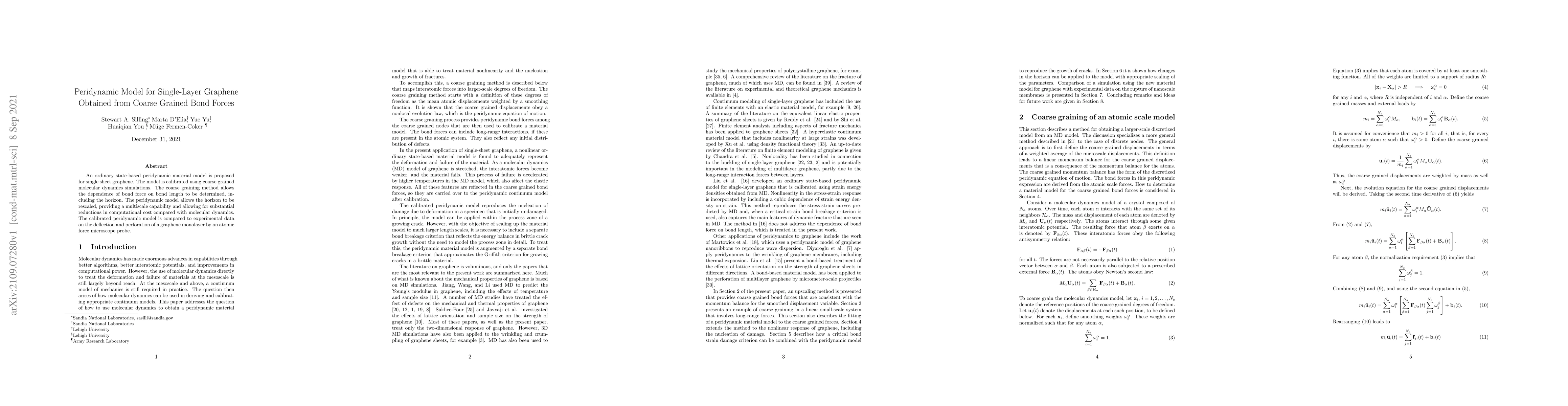 This paper proposes a state-based peridynamic model for single-layer graphene calibrated via coarse-grained molecular dynamics, enabling multiscale analysis and significant computational cost reductions. The model's accuracy is validated by comparing its predictions of graphene monolayer deflection and perforation with experimental data.