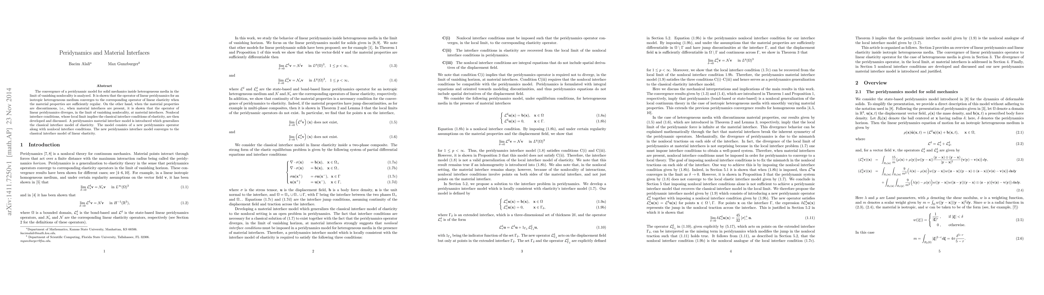 The convergence of a peridynamic model for solid mechanics inside heterogeneous media in the limit of vanishing nonlocality is analyzed. It is shown that the operator of linear peridynamics for an isotropic heterogeneous medium converges to the corresponding operator of linear elasticity when the material properties are sufficiently regular. On the other hand, when the material properties are discontinuous, i.e., when material interfaces are present, it is shown that the operator of linear peridynamics diverges, in the limit of vanishing nonlocality, at material interfaces. Nonlocal interface conditions, whose local limit implies the classical interface conditions of elasticity, are then developed and discussed. A peridynamics material interface model is introduced which generalizes the classical interface model of elasticity. The model consists of a new peridynamics operator along with nonlocal interface conditions. The new peridynamics interface model converges to the classical interface model of linear elasticity.