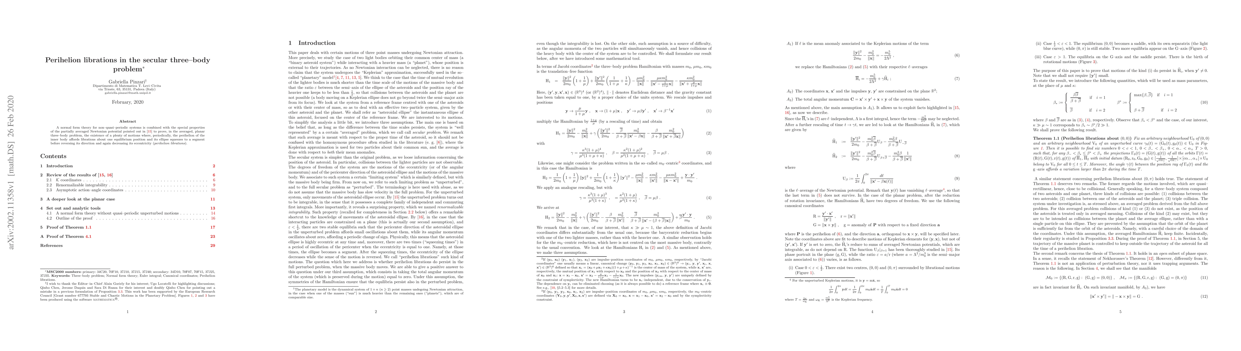A normal form theory for non--quasi--periodic systems is combined with the special properties of the partially averaged Newtonian potential pointed out in [15] to prove, in the averaged, planar three--body problem, the existence of a plenty of motions where, periodically, the perihelion of the inner body affords librations about one equilibrium position and its ellipse squeezes to a segment before reversing its direction and again decreasing its eccentricity (perihelion librations).