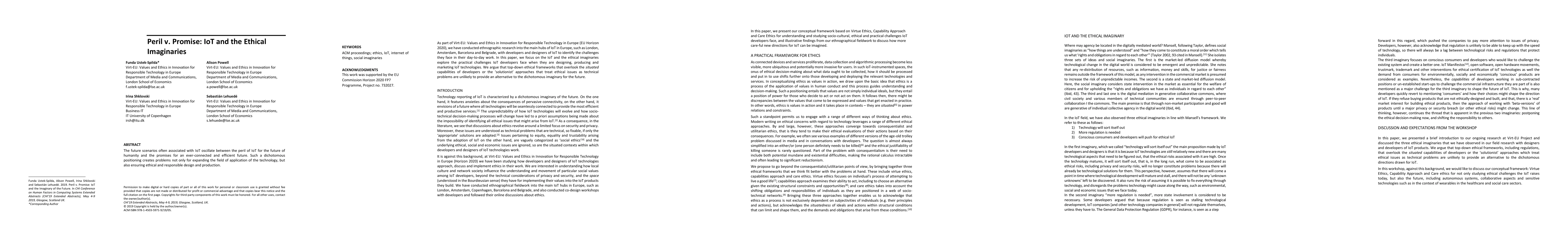 The future scenarios often associated with Internet of Things (IoT) oscillate between the peril of IoT for the future of humanity and the promises for an ever-connected and efficient future. Such a dichotomous positioning creates problems not only for expanding the field of application of the technology, but also ensuring ethical and responsible design and production. As part of VirtEU (Values and Ethics in Innovation for Responsible Technology in Europe) (EU Horizon 2020 FP7), we have conducted ethnographic research into the main hubs of IoT in Europe, such as London, Amsterdam, Barcelona and Belgrade, with developers and designers of IoT to identify the challenges they face in their day-to-day work. In this paper, we focus on the IoT and the ethical imaginaries explore the practical challenges IoT developers face when they are designing, producing and marketing IoT technologies. We argue that top-down ethical frameworks that overlook the situated capabilities of developers or the solutionist approaches that treat ethical issues as technical problems are unlikely to provide an alternative to the dichotomous imaginary for the future.