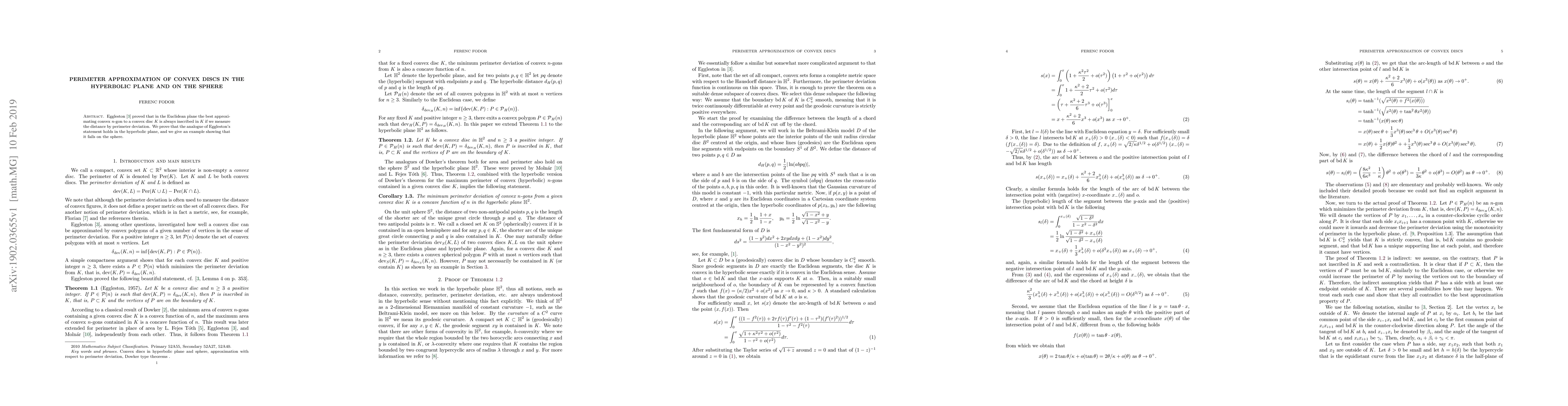 This paper proves that in the hyperbolic plane, the best convex $n$-gon approximating a convex disc minimizes perimeter deviation by being inscribed within the disc, mirroring Eggleston's Euclidean result. However, it provides an example demonstrating that this property does not hold in the spherical case.