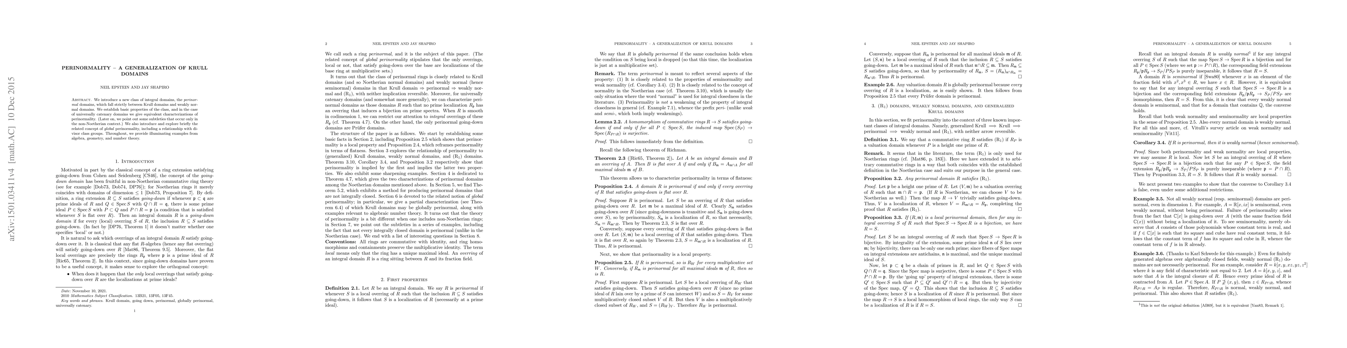 This paper introduces perinormal domains, a new class of integral domains situated between Krull domains and weakly normal domains, and establishes their basic properties. It also explores global perinormality and its connection to divisor class groups, providing examples from algebra, geometry, and number theory.