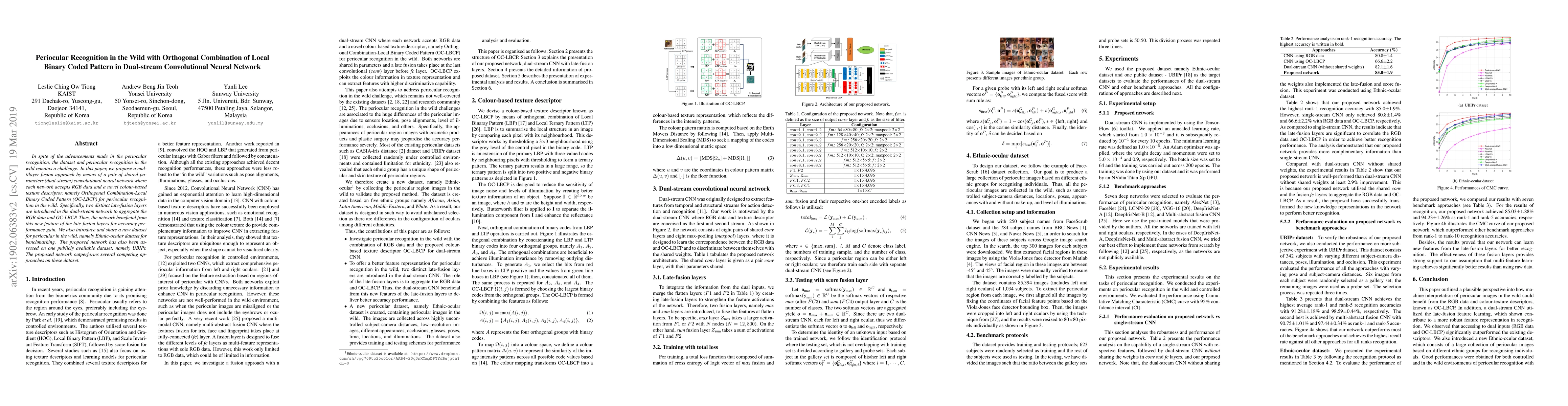 This paper proposes a dual-stream convolutional neural network for periocular recognition in the wild, utilizing RGB data and a novel OC-LBCP feature. The network employs late-fusion layers for improved accuracy, and a new Ethnic-ocular dataset is introduced for benchmarking.
