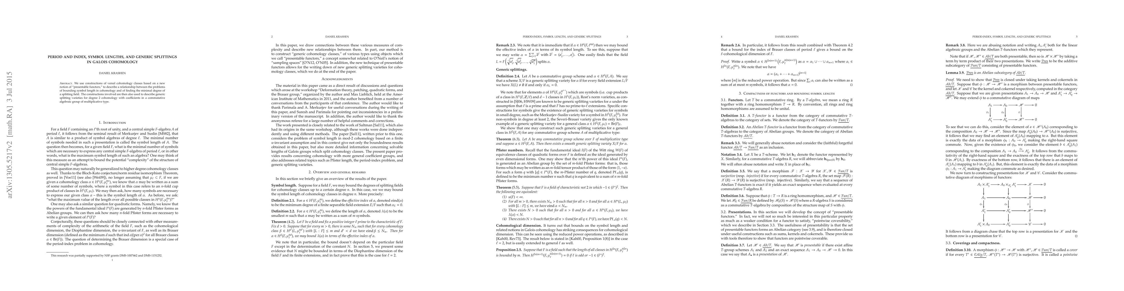 We use constructions of versal cohomology classes based on a new notion of "presentable functors," to describe a relationship between the problems of bounding symbol length in cohomology and of finding the minimal degree of a splitting field. The constructions involved are then also used to describe generic splitting varieties for degree 2 cohomology with coefficients in a commutative algebraic group of multiplicative type.