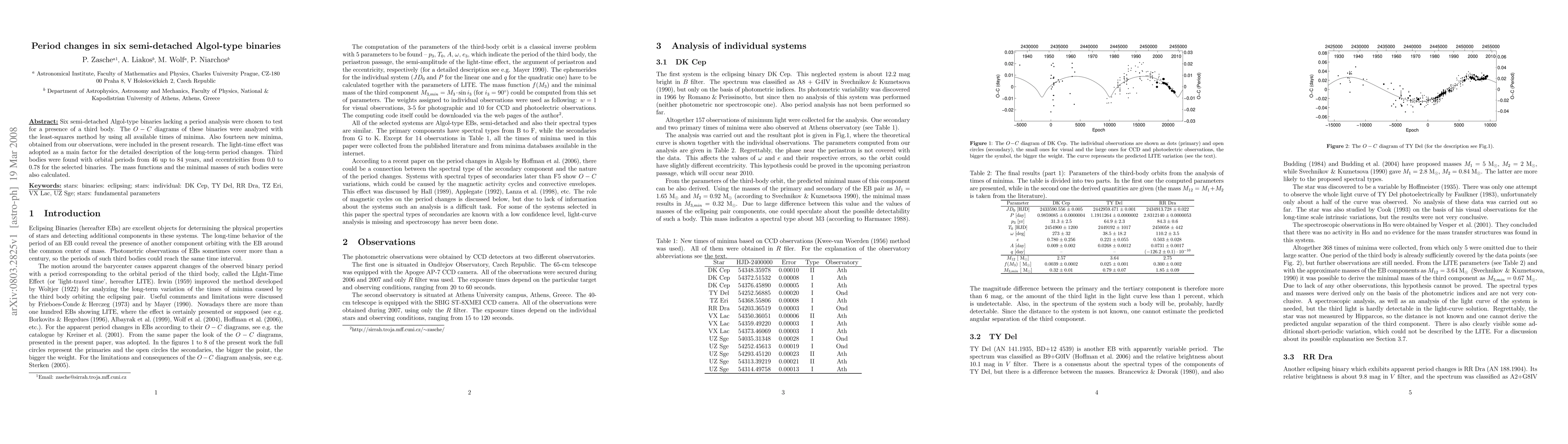 Researchers analyzed six semi-detached Algol-type binaries to detect third bodies, finding three with orbital periods of 46-84 years and masses ranging from minimal to significant.