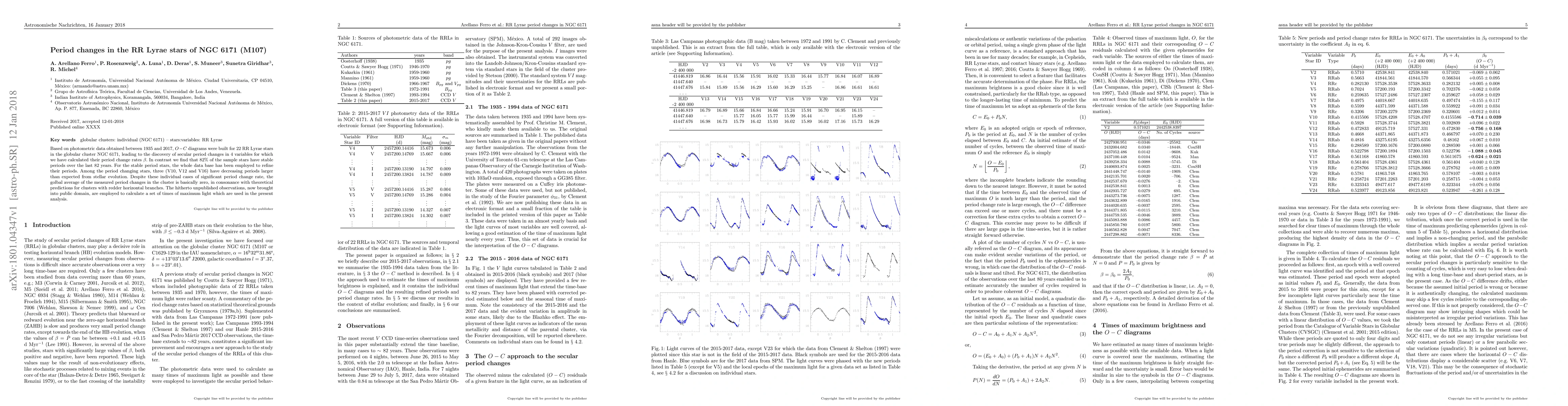Based on photometric data obtained between 1935 and 2017, $O-C$ diagrams were built for 22 RR Lyrae stars in the globular cluster NGC 6171, leading to the discovery of secular period changes in 4 variables for which we have calculated their period change rates $\beta$. In contrast we find that $82\%$ of the sample stars have stable periods over the last 82 years. For the stable period stars, the whole data base has been employed to refine their periods. Among the period changing stars, three (V10, V12 and V16) have decreasing periods larger than expected from stellar evolution. Despite these individual cases of significant period change rate, the golbal average of the measured period changes in the cluster is basically zero, in consonance with theoretical predictions for clusters with redder horizontal branches. The hitherto unpublished observations, now brought into public domain, are employed to calculate a set of times of maximum light which are used in the present analysis.
