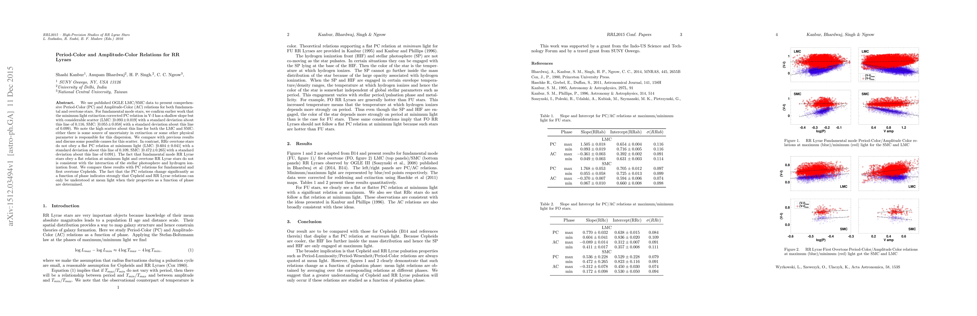 This study presents Period-Color relations for RR Lyrae stars, finding that fundamental mode stars obey a flat relation but overtone stars do not, with possible explanations including stellar photosphere and hydrogen ionization front interactions.