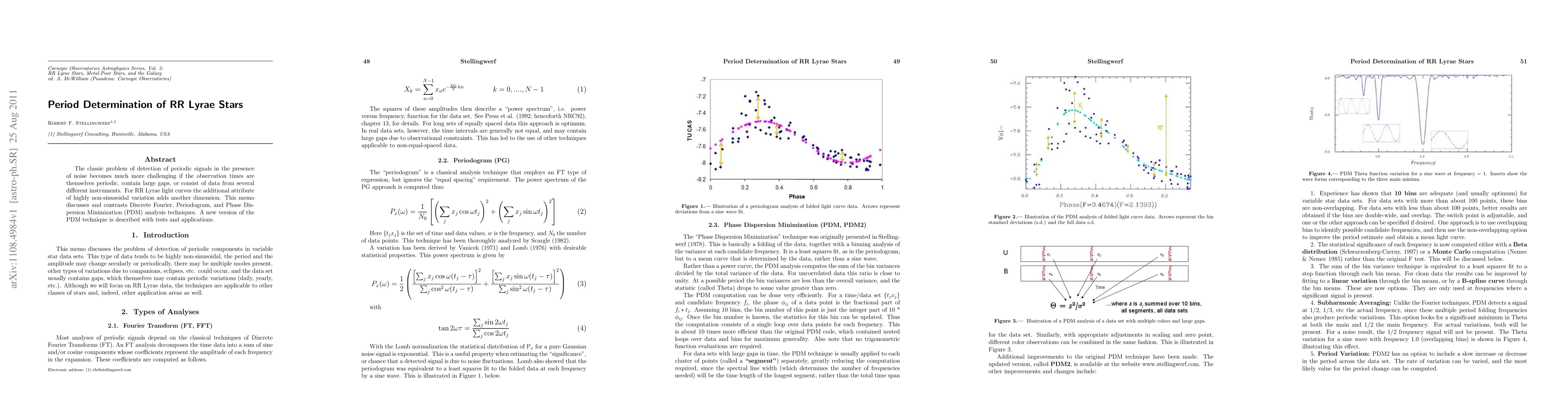 The classic problem of detection of periodic signals in the presence of noise becomes much more challenging if the observation times are themselves periodic, contain large gaps, or consist of data from several different instruments. For RR Lyrae light curves the additional attribute of highly non-sinusoidal variation adds another dimension. This memo discusses and contrasts Discrete Fourier, Periodogram, and Phase Dispersion Minimization (PDM) analysis techniques. A new version of the PDM technique is described with tests and applications.