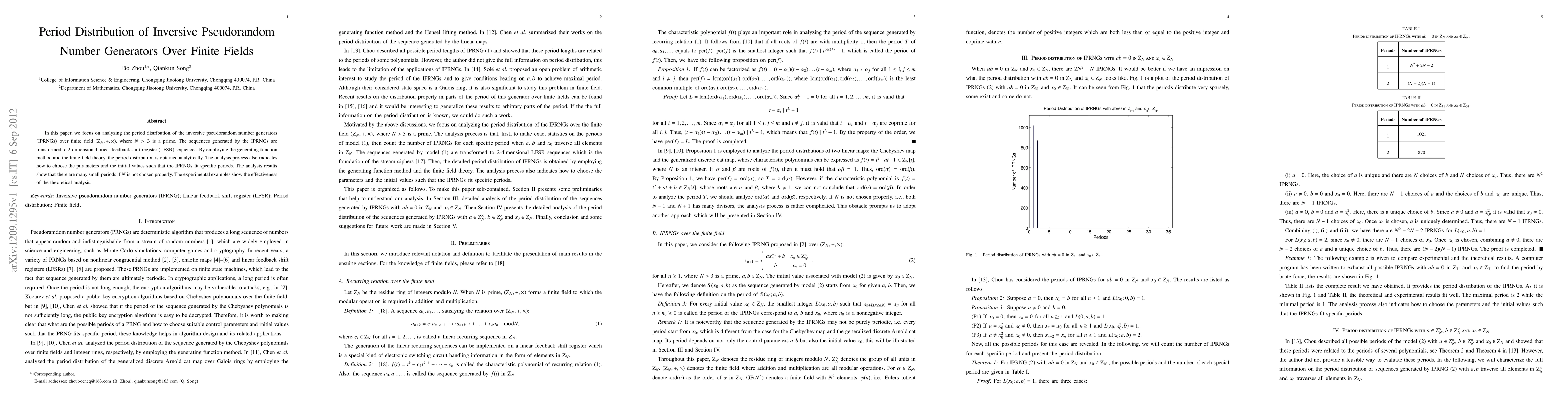 This paper analyzes the period distribution of inversive pseudorandom number generators (IPRNGs) over finite fields, transforming them into 2-dimensional linear feedback shift register sequences. Using generating functions and finite field theory, it provides an analytical method for determining period distribution and demonstrates how to select parameters and initial values for specific periods, highlighting the risk of small periods if $N$ is improperly chosen.